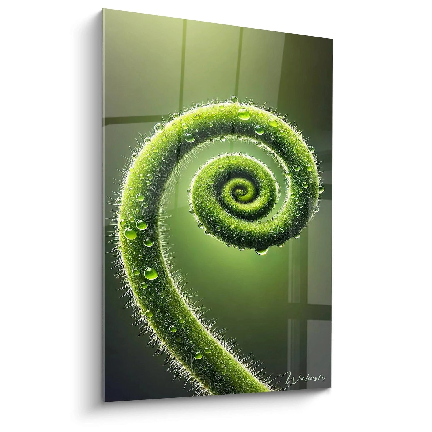 Ce tableau célèbre la perfection des formes naturelles, où chaque courbe semble vibrer d’une énergie paisible. Les gouttes de rosée, comme des perles de lumière, éblouissent par leur éclat cristal, offrant une expérience visuelle apaisante qui nourrit la contemplation. Sous vos yeux, cette spirale verte s’anime doucement, apportant une sensation immédiate de fraîcheur et de renouveau.