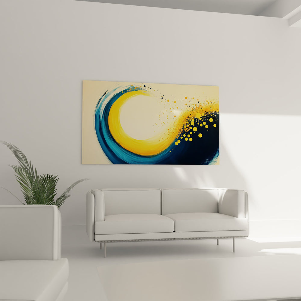 Ce tableau mural spirale abstraite présente une composition dynamique où une vague dorée lumineuse s'élève majestueusement sur un fond crème délicat. La spirale dorée forme un mouvement ascendant captivant, créant une sensation de fluidité et d'énergie pure. Les nuances de bleu profond contrastent harmonieusement avec les tons dorés éclatants, tandis que de subtiles particules dorées semblent flotter dans l'espace, ajoutant une dimension cosmique à l'ensemble. Cette peinture abstraite moderne évoque le mouvement perpétuel des vagues océaniques fusionnant avec la lumière solaire. Les brushstrokes visibles apportent une texture authentique à cette œuvre d'art contemporaine, où chaque courbe de la spirale guide le regard vers le centre lumineux. L'artiste a magistralement utilisé la technique des dégradés pour créer cette décoration murale élégante qui transforme instantanément l'atmosphère d'un espace. Les éclaboussures dorées dispersées créent un effet de mouvement naturel, rappelant les gouttes d'eau illuminées par les rayons du soleil. Cette toile abstraite premium s'impose comme une pièce maîtresse capable d'apporter sophistication et dynamisme à tout intérieur contemporain.