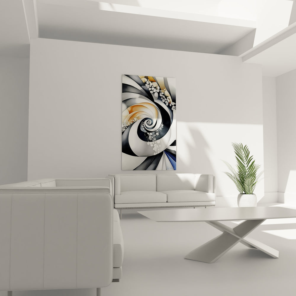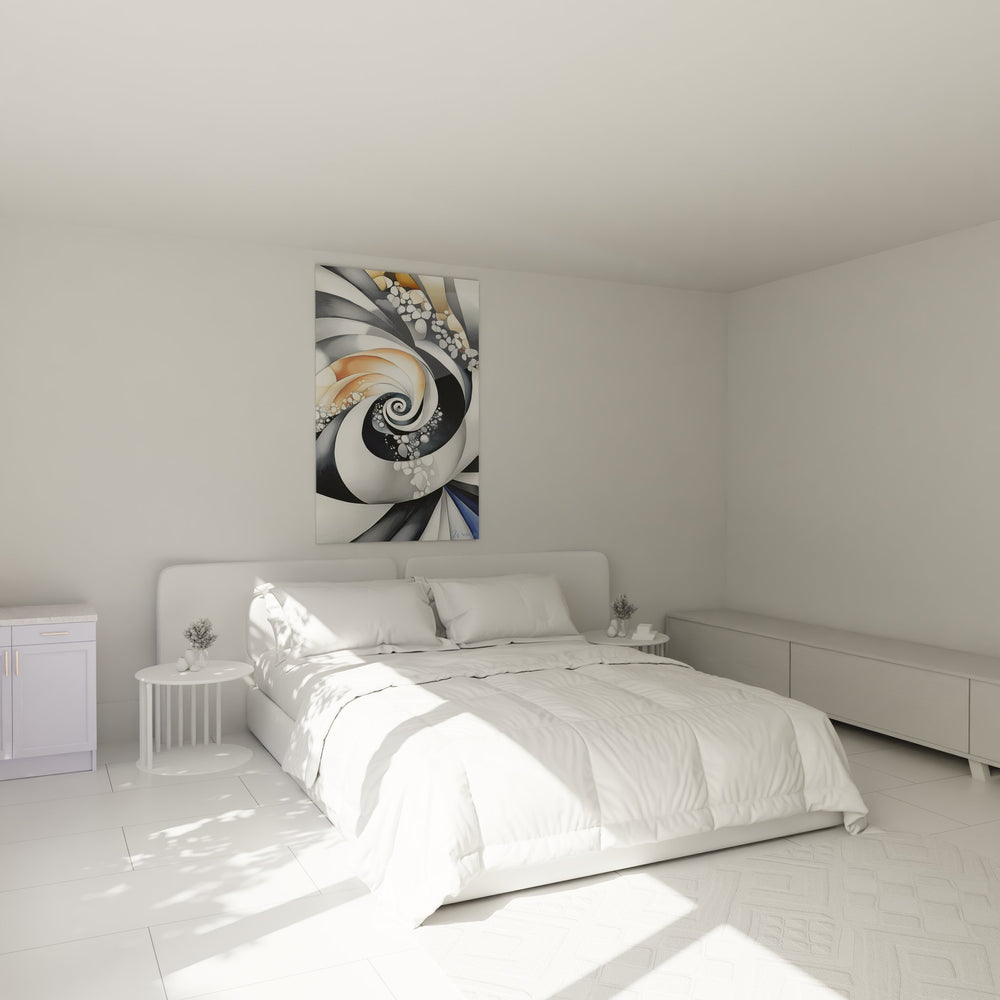 Cette œuvre d'art contemporaine présente un tableau spirale abstrait d'une complexité visuelle saisissante. Au centre de la composition, un tourbillon dynamique se déploie en courbes fluides, créant un mouvement perpétuel qui captive le regard. Les reflets métalliques dominent l'ensemble avec des nuances d'argent, de chrome et d'acier brossé qui se mêlent harmonieusement à des touches dorées et cuivrées. Ce tableau mural moderne exploite les jeux de lumière à travers des surfaces polies et texturées, créant des effets de profondeur remarquables. Les éléments circulaires dispersés le long de la spirale évoquent des bulles ou des perles, ajoutant une dimension tactile à cette décoration murale contemporaine. L'artiste a magistralement orchestré un dialogue entre les zones sombres et claires, où le noir profond contraste avec les blancs éclatants et les tons nacrés. Cette œuvre abstraite géométrique transcende la simple représentation pour devenir une méditation visuelle sur le mouvement et la transformation, parfaite pour sublimer un intérieur moderne.