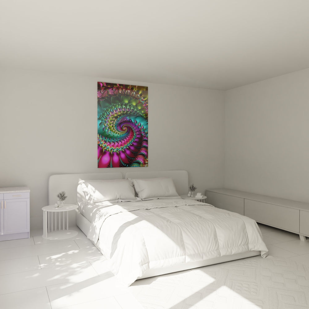 Ce tableau mural spirale fractale offre une plongée hypnotique dans l'univers des mathématiques artistiques et de l'art psychédélique contemporain. L'œuvre révèle une spirale centrale majestueuse qui se déploie en fractales infinies, créant un effet de profondeur vertigineux. Les motifs géométriques complexes s'entremêlent dans une danse visuelle fascinante, où chaque élément semble généré par des algorithmes mathématiques sophistiqués. Cette décoration murale moderne fractale présente des textures détaillées qui évoquent des écailles irisées ou des structures organiques microscopiques. Le tableau abstrait spirale colorée capture l'attention par ses détails infinis, invitant l'observateur à explorer chaque recoin de cette composition digitale. Les formes s'imbriquent parfaitement, créant un rythme visuel qui guide l'œil vers le centre de la spirale. Cette œuvre d'art murale géométrique transforme l'espace en portail vers une dimension parallèle, où la géométrie sacrée rencontre l'art numérique. Le design fractal décoratif s'adapte parfaitement aux intérieurs contemporains cherchant une touche d'originalité et de sophistication mathématique.