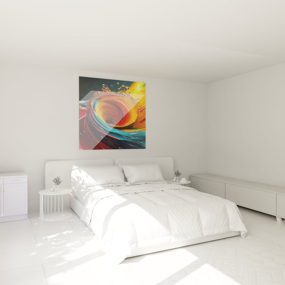 Ce tableau mural spirale abstrait présente une composition saisissante d'un vortex liquide multicolore aux teintes flamboyantes. L'œuvre capture un moment figé où les fluides colorés se mélangent dans un mouvement tourbillonnant hypnotique. Les couleurs chaudes orangées dominent le centre de la spirale, créant un effet de profondeur intense qui attire immédiatement le regard vers le cœur du vortex. Les nuances bleu turquoise et rouge carmin s'entremêlent harmonieusement, formant des couches fluides qui semblent défier les lois de la gravité. L'art abstrait contemporain trouve ici une expression parfaite à travers cette représentation de mouvement figé. Les éclaboussures cristallines qui s'échappent du tourbillon principal ajoutent une dimension dynamique à l'ensemble, évoquant la force centrifuge d'un liquide en rotation. Ce tableau spirale moderne transforme l'espace par sa présence magnétique et ses reflets lumineux dorés qui semblent irradier depuis le centre. L'arrière-plan flou renforce l'effet de focus sur la spirale principale, créant une profondeur de champ photographique qui sublime cette œuvre d'art mural abstraite.