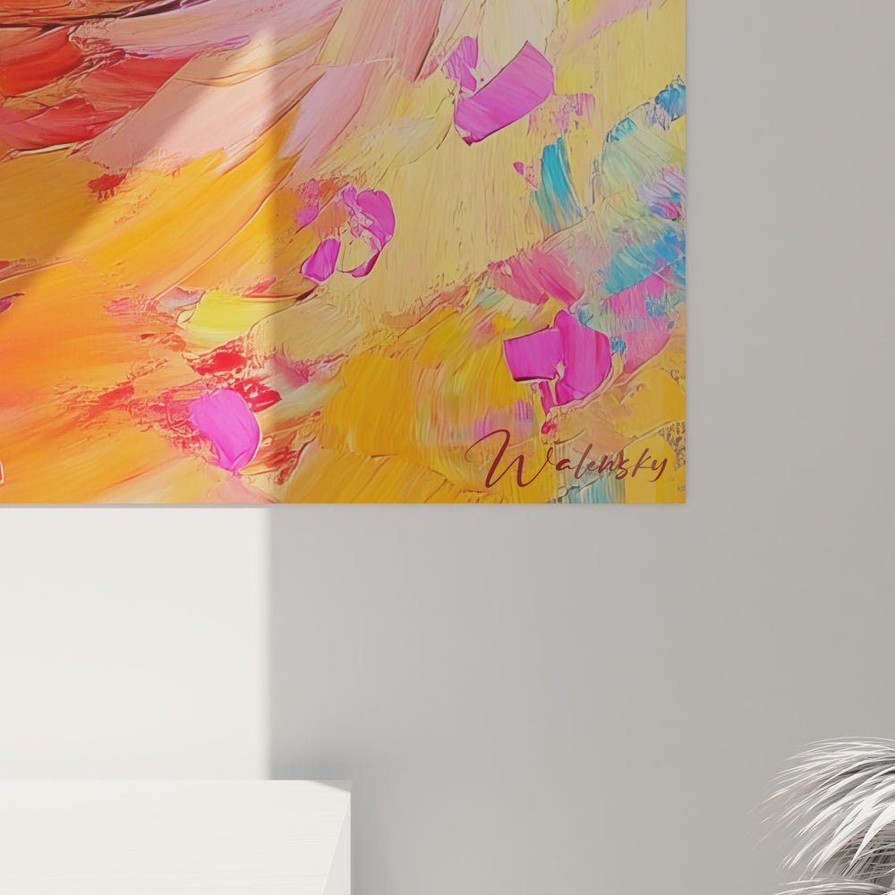 La spirale symbolique représente universellement le cycle de la vie, l'évolution et la transformation perpétuelle. Les couleurs chaudes dominantes - jaune, orange, rose - évoquent l'énergie vitale, la créativité et la passion, tandis que les touches de violet et de bleu apportent une dimension spirituelle et contemplative. Cette harmonie chromatique crée un équilibre parfait entre dynamisme et sérénité, rendant cette œuvre adaptée à tous les environnements décoratifs.