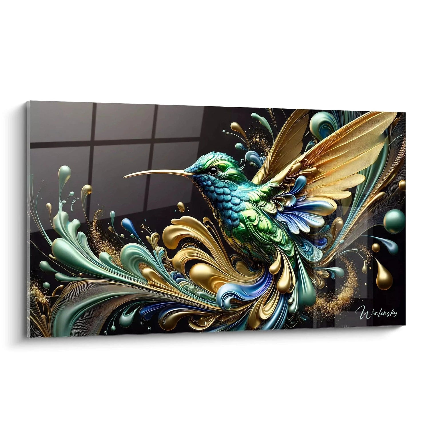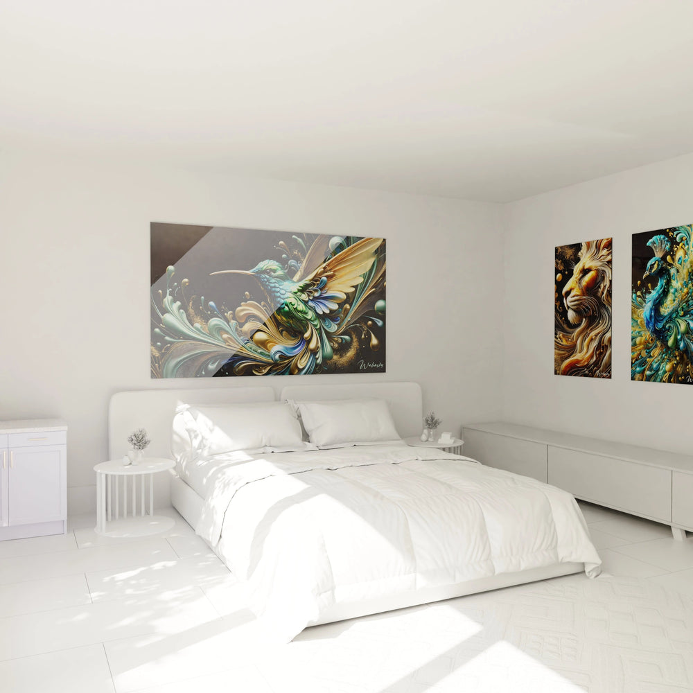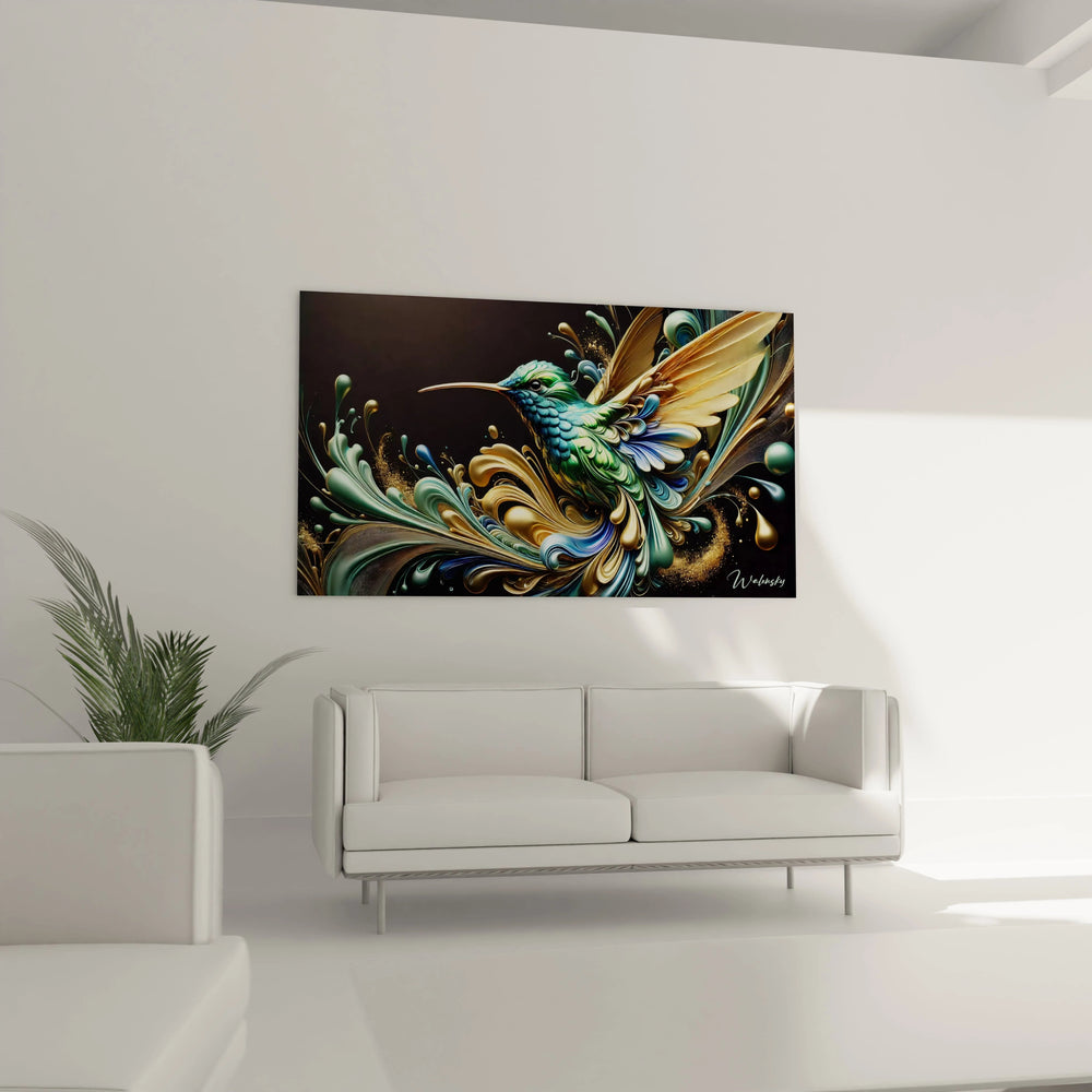 Chaque battement d’ailes du colibri à travers ce tableau évoque une sensation de liberté aérienne et de fraîcheur naturelle. Les nuances de vert profond, d’or lumineux et de bleu apaisant créent un équilibre parfait qui apaise tout en dynamisant. Visualisez cette harmonie s’infiltrant dans votre salon, bureau ou chambre, transformant chaque instant en un moment suspendu, presque onirique.