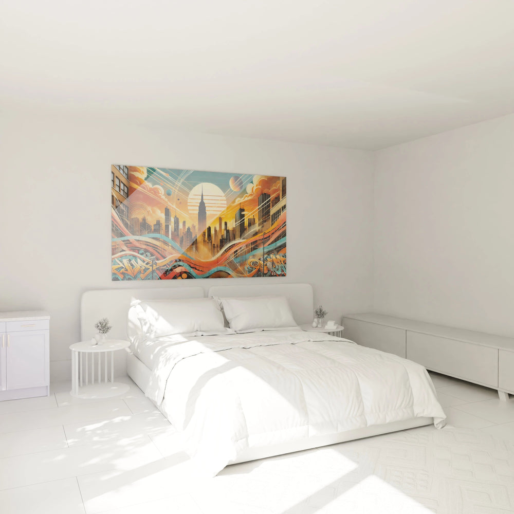 Ce tableau incarne le contraste fascinant entre la rigidité architecturale et le souffle libre du street art. Chaque trait, chaque splash de couleur raconte cette tension incessante entre le statique et le mouvement, cette énergie urbaine qui vous enveloppe dès que vous posez le regard dessus. L’orange chaud du coucher de soleil, mêlé aux nuances profondes de bleu et de noir, offre une palette raffinée qui évoque à la fois l’espoir et la mélancolie, vous immergeant dans une atmosphère unique de dynamisme et de poésie.
