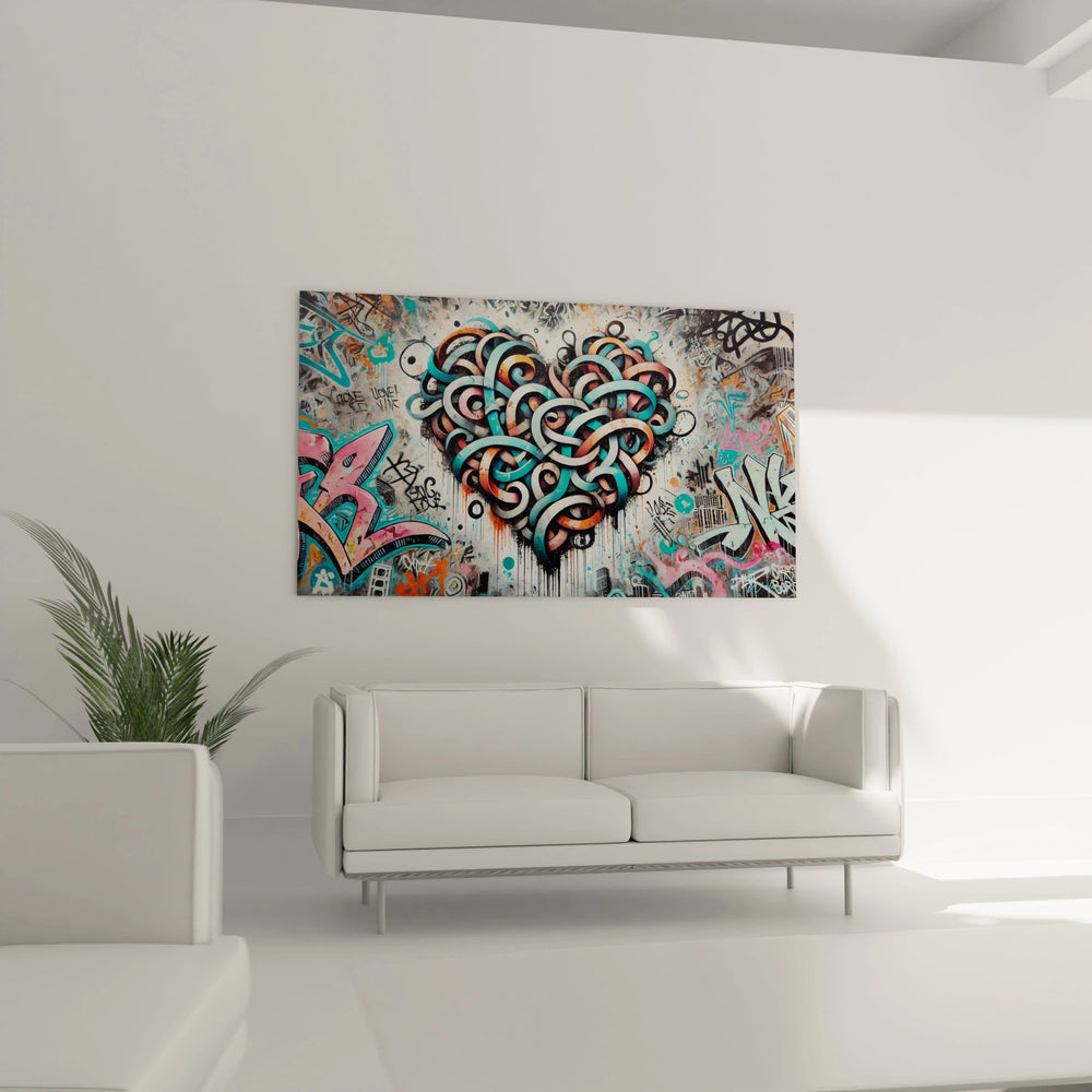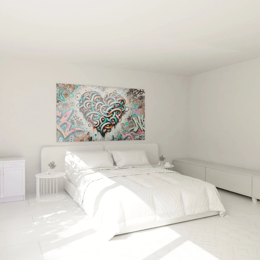 Je me suis inspiré des artistes de rue légendaires, dont Banksy et Shepard Fairey, pour insuffler à cette création la liberté d’expression et la puissance narrative du Street Art. Le cœur central est le symbole d’une passion partagée, d’un message d’unité et d’audace, inscrit dans chaque détail du tableau.