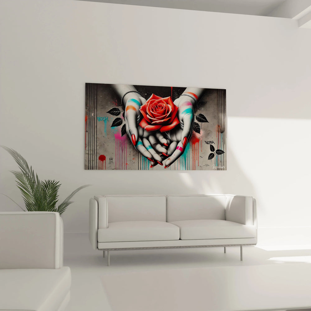 Imaginez des mains monochromes, tenant avec soin une rose rouge éclatante — symbole vivant de passion, de vie et d’espoir. Ce contraste saisissant vous saisit dès le premier regard. La rose, lumineuse et luxuriante, s’impose comme une étincelle de beauté au cœur d’un environnement urbain brut et chaotique. Les éclaboussures de peinture, spontanées et audacieuses, insufflent à la toile une énergie vibrante, mécanique et imprévisible, typique de l’art de rue que vous adorez.