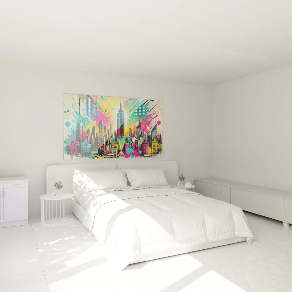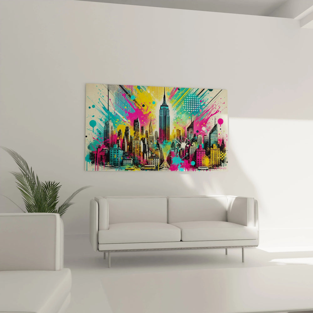 Cette œuvre est une invitation au voyage sensoriel dans l’effervescence de la ville. Des éclaboussures éclatantes de jaune, de rose et de bleu dansent sur la toile, mêlant avec maestria la rigueur du pop art aux spontanéités des graffitis. Chaque coup de pinceau projette un dynamisme palpable, un souffle d’adrénaline artistique qui s’installe instantanément dans la pièce où vous choisissez de le poser.