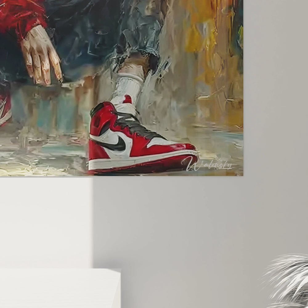 Le traitement artistique révèle une technique picturale expressive où chaque coup de pinceau contribue à l'atmosphère générale de l'œuvre. Les lunettes futuristes qui ornent le visage du personnage ajoutent une dimension cyberpunk à l'ensemble, évoquant les codes esthétiques de la culture urbaine digitale. Les sneakers rouge et blanc, fidèles à l'iconographie streetwear, ancrent définitivement l'œuvre dans son époque et sa culture de référence.