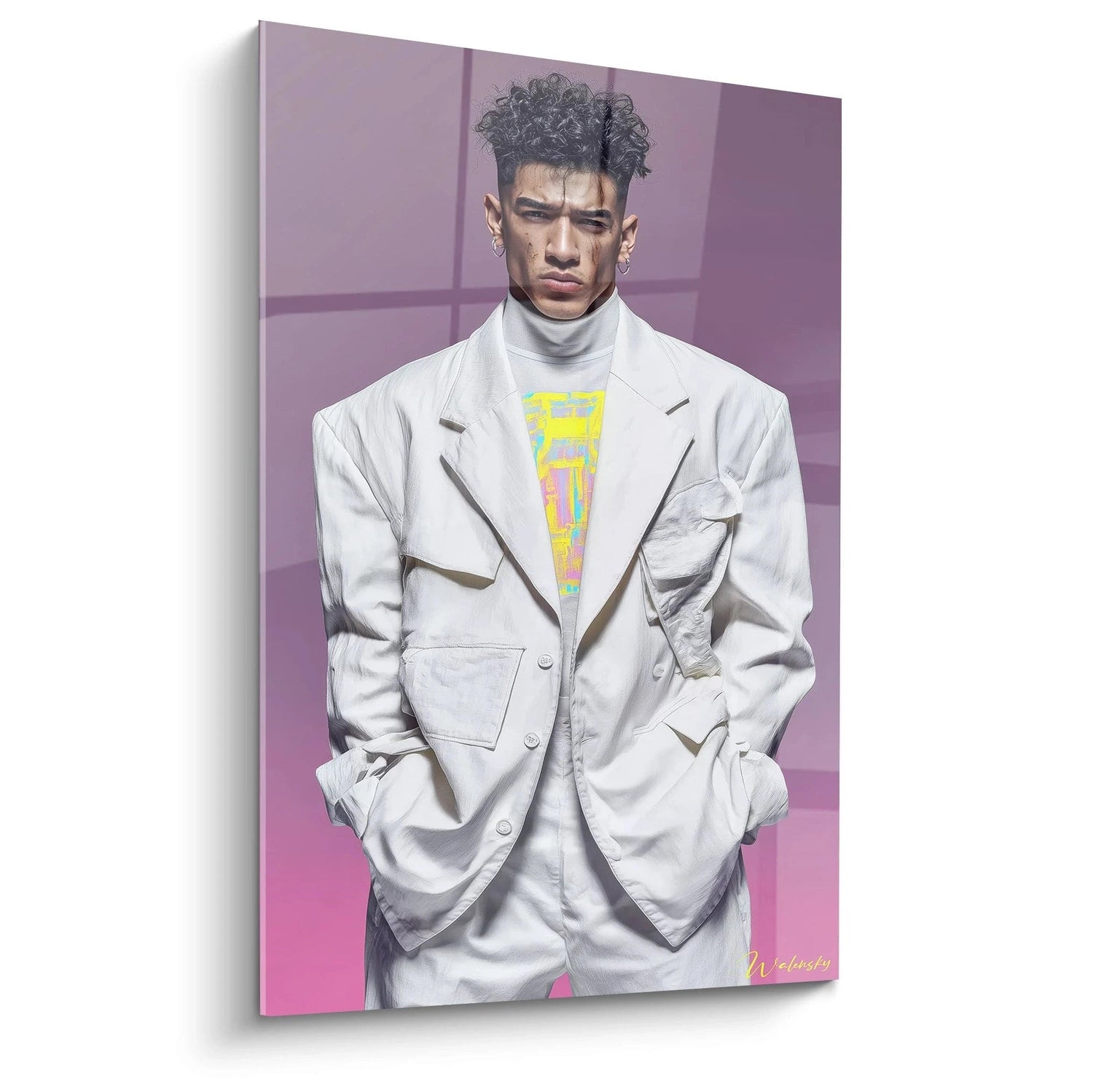 Cette représentation artistique véhicule une symbolique forte de la masculinité moderne, libérée des codes traditionnels. Les couleurs froides du dégradé violet-rose évoquent la sensibilité et l'émotion, contrastant avec l'attitude assurée du modèle. Cette dualité représente parfaitement l'évolution de la perception masculine contemporaine, où force et vulnérabilité coexistent harmonieusement dans cet art mural beauté masculine. Les tons pastel du t-shirt géométrique apportent une note de légèreté qui tempère l'intensité du regard, créant un équilibre visuel parfait.