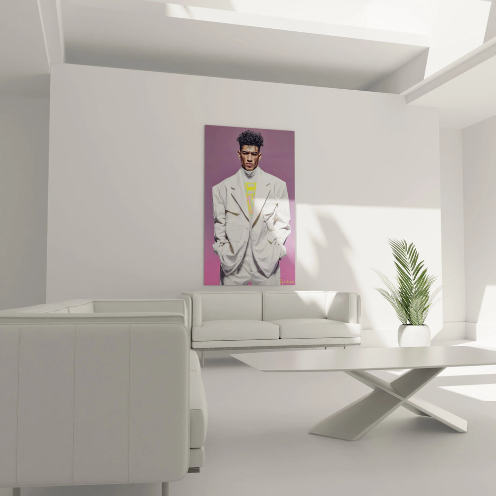 Ce tableau décoratif masculin s'inscrit dans la lignée des grands portraitistes contemporains comme Kehinde Wiley ou Amy Sherald, qui réinventent le portrait classique avec des codes modernes. L'approche esthétique rappelle également les travaux de photographes de mode comme Mario Testino ou Steven Meisel, maîtres du portrait fashion masculin. L'influence du mouvement artistique afrofuturiste se ressent dans cette célébration de la beauté masculine noire, tandis que la composition géométrique évoque les œuvres de David Hockney dans sa période californienne.