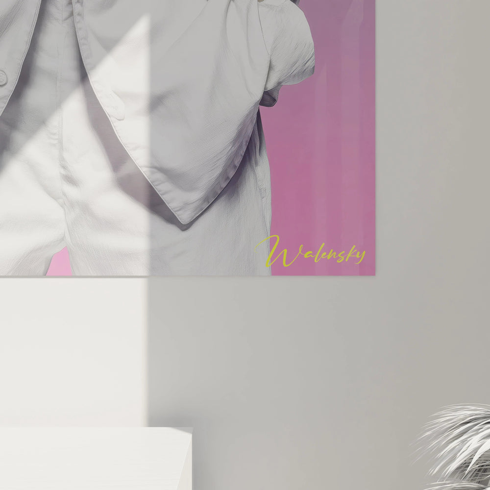L'arrière-plan de l'œuvre joue un rôle crucial dans la composition globale, avec son dégradé magistral qui évolue du violet profond vers des nuances de rose magenta. Cette palette chromatique crée un contraste saisissant qui fait ressortir le sujet principal tout en apportant une dimension artistique contemporaine à l'ensemble. La qualité photographique exceptionnelle de ce tableau mural portrait masculin en fait une décoration murale homme moderne de choix pour les espaces contemporains.