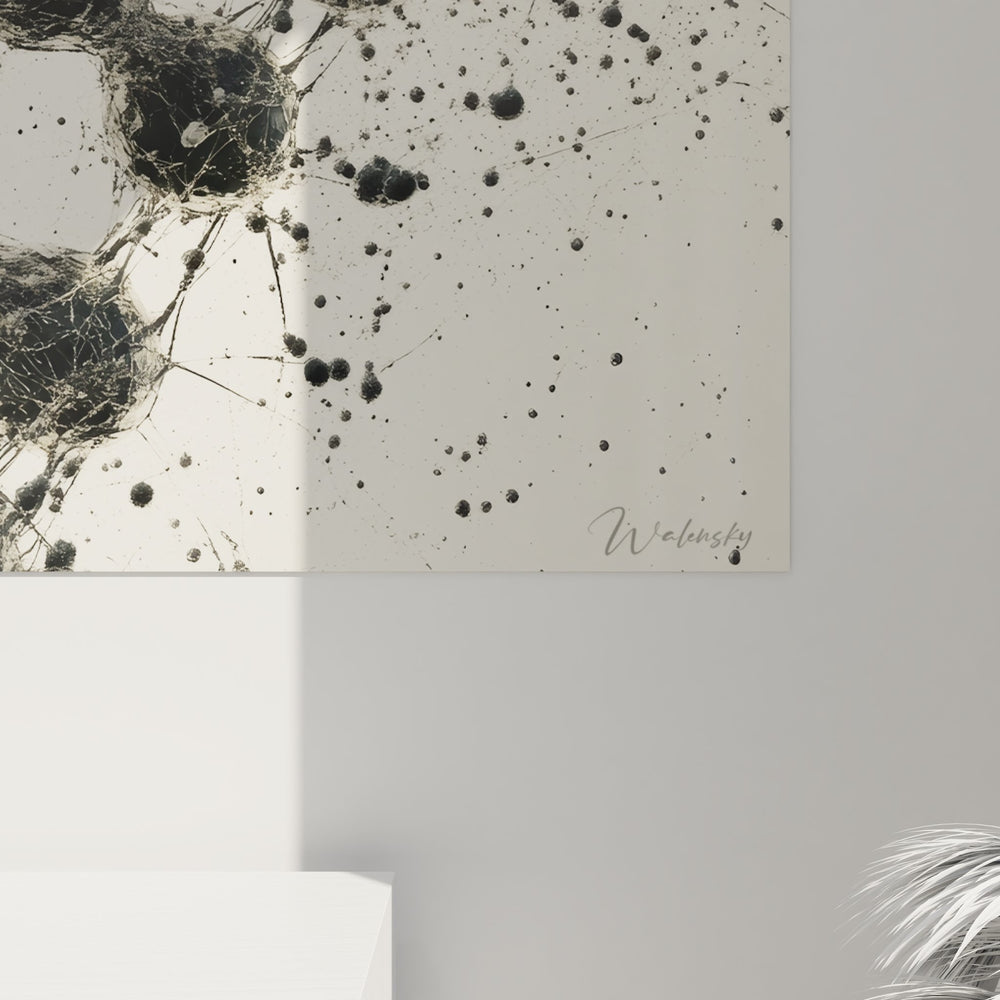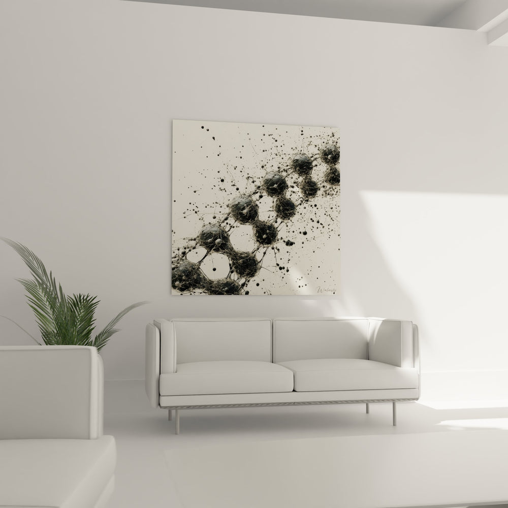 Ce tableau mural ADN présente une composition artistique saisissante où les structures moléculaires prennent vie dans un style abstrait contemporain. L'œuvre révèle un ensemble de formes circulaires interconnectées, évoquant les hélices ADN et les liaisons chimiques fondamentales de la vie. Le traitement graphique en noir et blanc confère à ce tableau scientifique moderne une dimension à la fois technique et poétique. Les cercles de différentes tailles, reliés par des lignes fines et des projections d'encre, créent un réseau complexe rappelant la double hélice ADN. Cette œuvre d'art génétique capture l'essence même de la structure génétique à travers une approche artistique innovante. Les éclaboussures et les traits spontanés apportent une dynamique organique qui contraste avec la rigueur scientifique du sujet. Ce tableau décoratif ADN s'inscrit parfaitement dans la tendance de l'art scientifique contemporain, où la beauté de la science rencontre l'expression artistique. L'artiste a su transformer la complexité moléculaire en une composition visuelle accessible et esthétiquement remarquable.