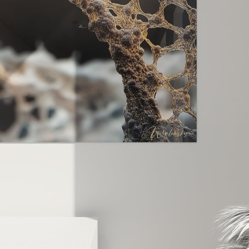 La palette chromatique de ce tableau structure génétique joue sur les tons dorés et cuivrés, évoquant la préciosité et la valeur inestimable de notre code génétique. Ces couleurs chaudes symbolisent la vie, l'énergie et la continuité de l'espèce humaine. La structure alvéolaire représente l'organisation parfaite de la nature, démontrant que la science peut être source d'inspiration artistique profonde.