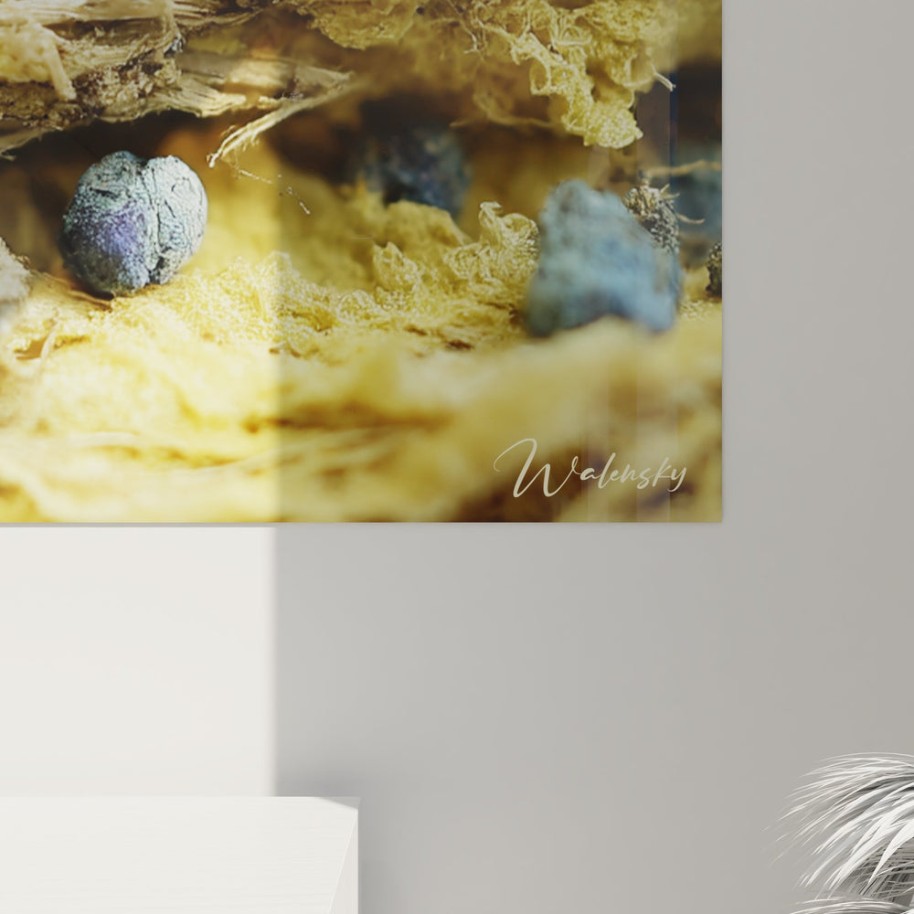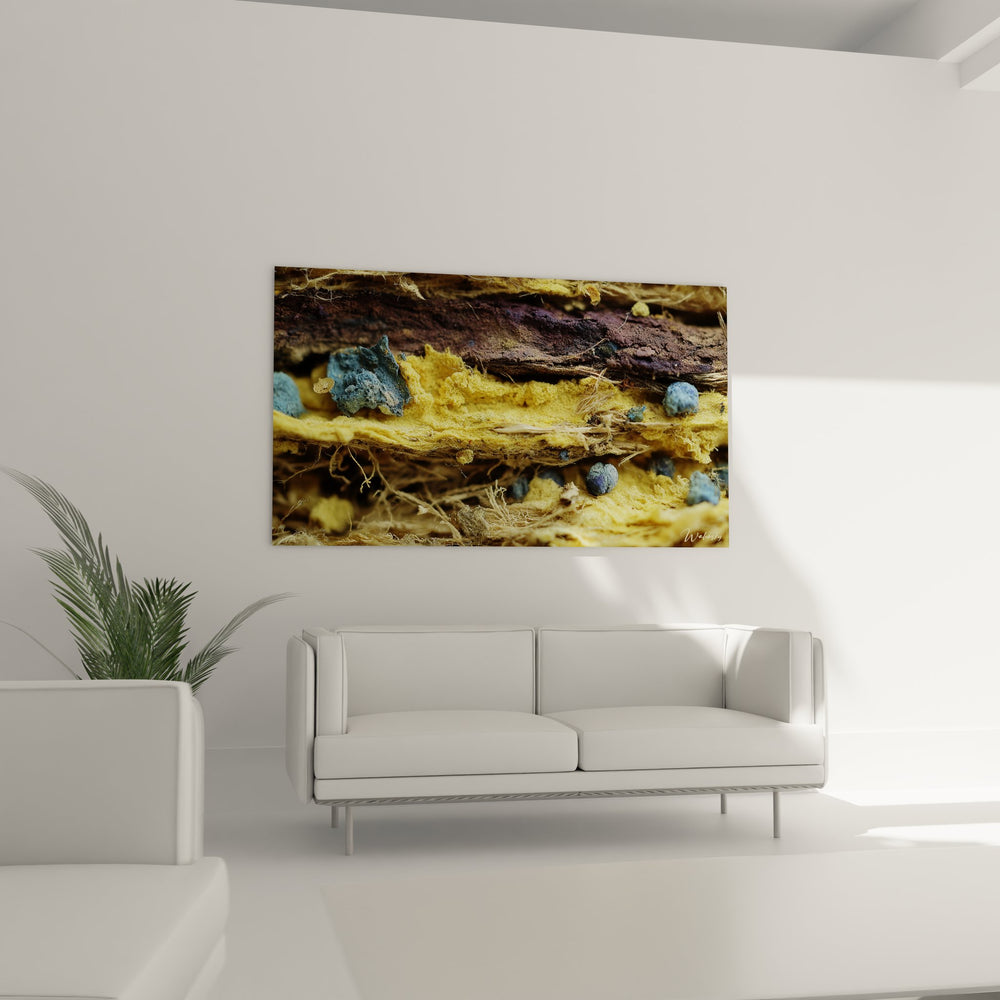 Ce tableau mural réseau synaptique présente une vision fascinante du monde microscopique à travers la technique du collage. L'œuvre révèle un univers de structures organiques aux couleurs vibrantes, où dominent les tons jaunes dorés, bleus azur et violets profonds. Les formations ressemblent à des connexions neuronales ou à des tissus biologiques observés au microscope, créant une composition d'une richesse visuelle extraordinaire. Cette art microscopique capture l'essence même de la vie cellulaire avec ses textures rugueuses et ses formes organiques complexes. Les éléments bleus, semblables à des spores ou des vésicules, ponctuent la composition et apportent un contraste saisissant avec les masses jaunes fibreuses. Ce tableau décoratif moderne transforme l'invisible en visible, offrant une perspective unique sur les structures biologiques complexes qui composent notre organisme. L'artiste a su créer une œuvre qui évoque à la fois la beauté et la complexité du réseau cellulaire vivant, faisant de chaque détail une découverte visuelle captivante.
