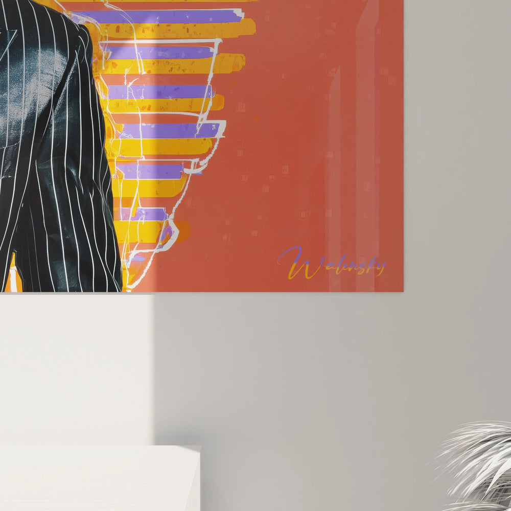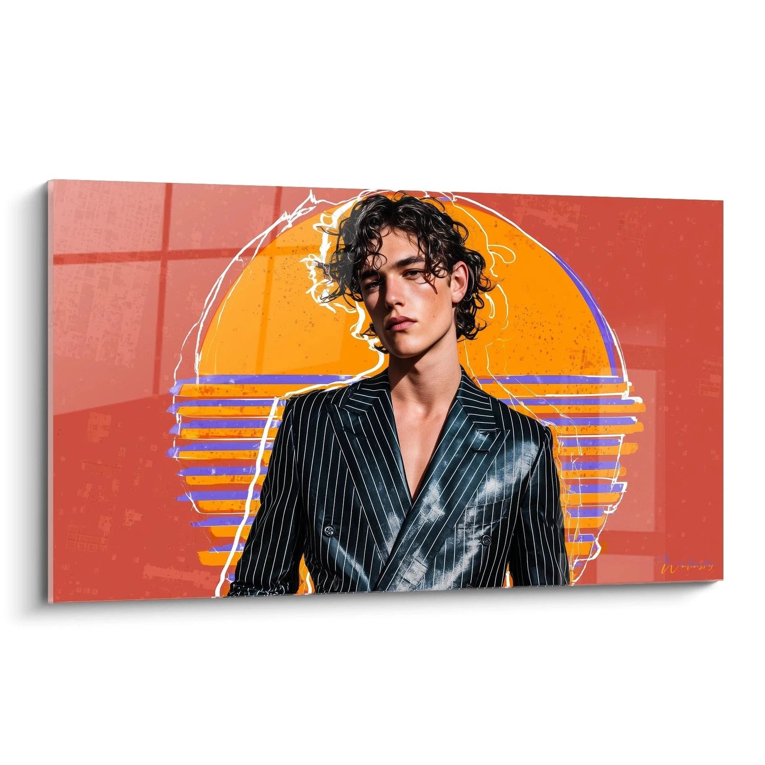 Ce tableau mural portrait masculin présente un portrait saisissant d'un jeune homme aux cheveux bouclés bruns, incarnant parfaitement l'élégance masculine contemporaine. Vêtu d'une veste blazer rayée noire sophistiquée, le modèle dégage une aura de confiance et de séduction qui captive immédiatement le regard. Son expression intense et son regard perçant créent une connexion émotionnelle forte avec l'observateur. L'arrière-plan se compose d'un dégradé vibrant allant du rouge profond à l'orange éclatant, évoquant l'esthétique rétro-futuriste des années 80-90. Un cercle orange lumineux encadre harmonieusement le personnage, tandis que des lignes horizontales bleues et oranges traversent la composition, apportant dynamisme et profondeur à l'ensemble. Cette œuvre d'art murale combine magistralement photographie haute définition et design graphique contemporain, créant une pièce décorative unique qui transformera instantanément l'ambiance de votre intérieur. La qualité d'impression exceptionnelle met en valeur chaque détail, des textures de la veste aux jeux de lumière sur le visage du modèle, faisant de ce tableau décoratif masculin une pièce maîtresse pour votre décoration murale moderne.