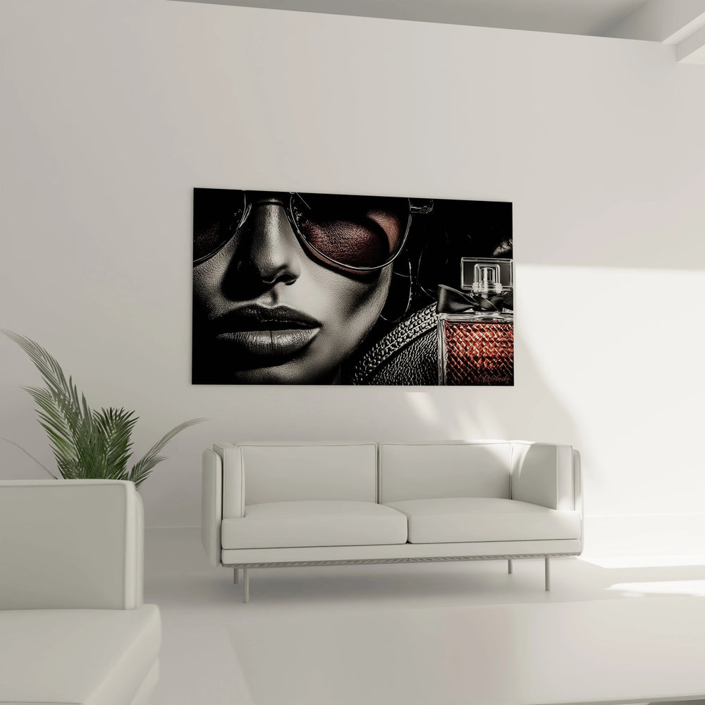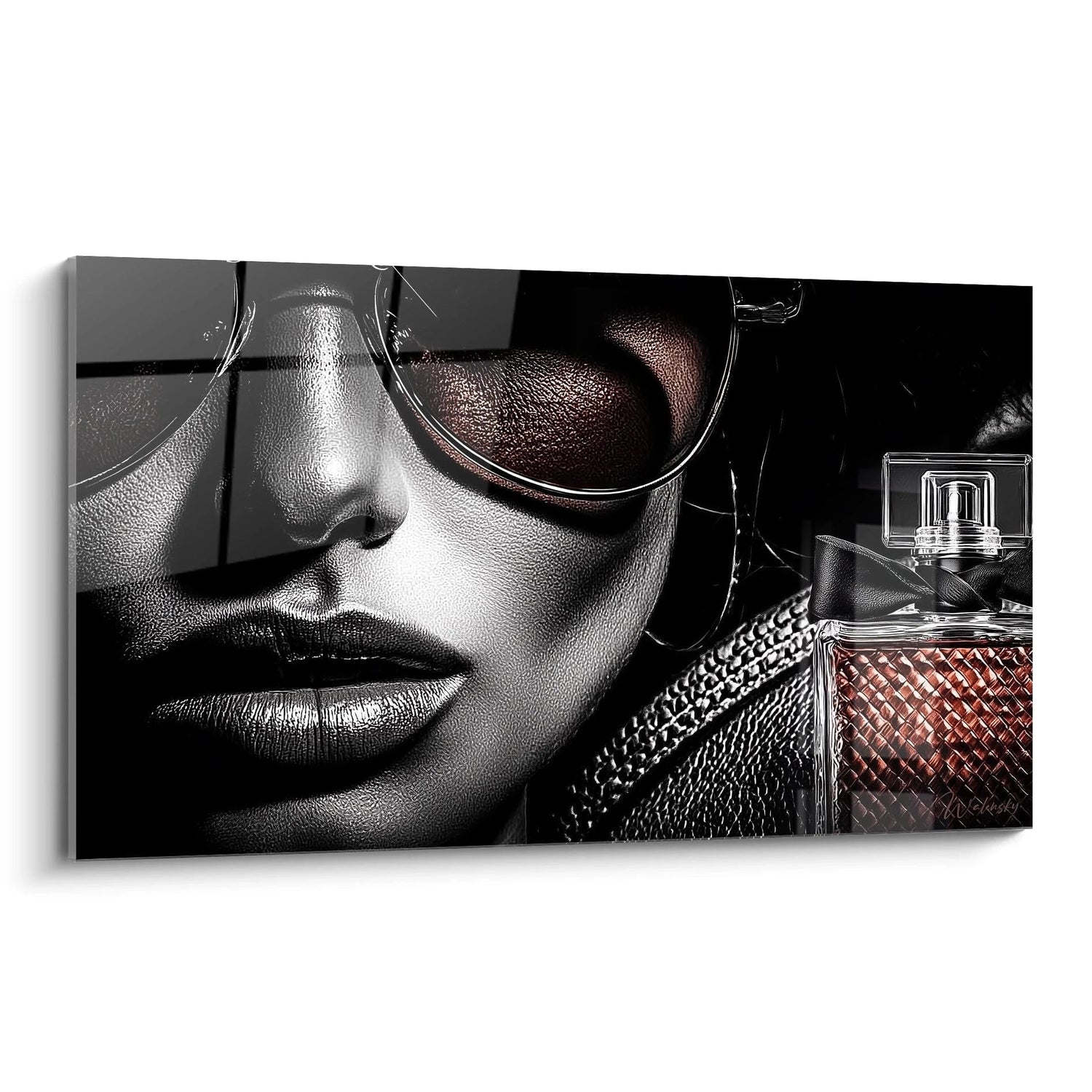 accessoires de mode, parfum luxe, lunettes de soleil, portrait noir et blanc, décoration murale