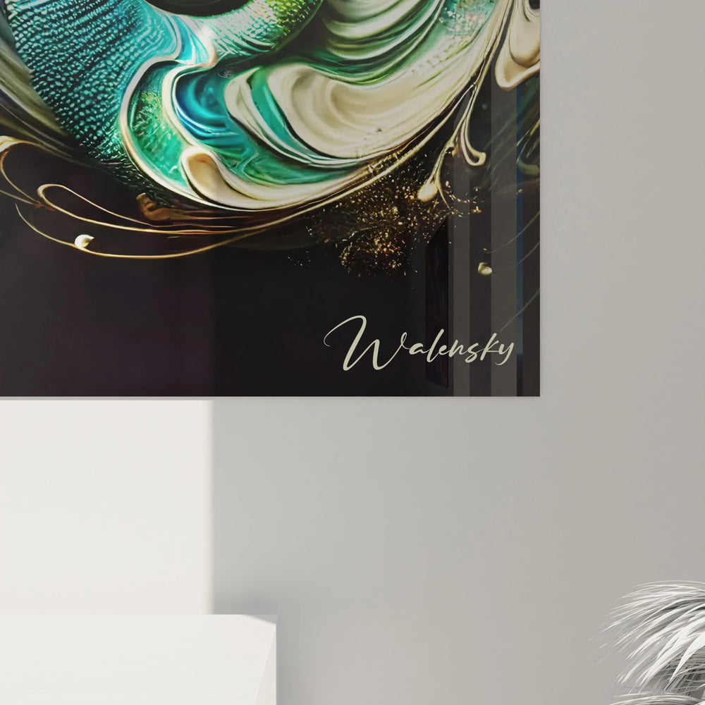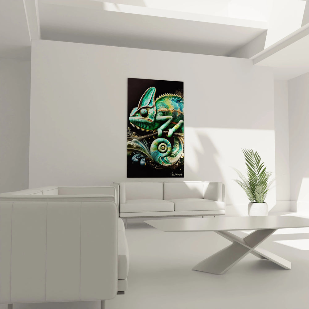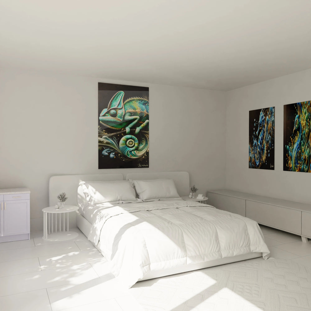 Chaque coup de pinceau révèle un univers où la douceur des formes organiques se marie avec la précision fascinante des détails réalistes. Les teintes profondes de vert, bleu et or évoquent tour à tour la fraîcheur d'une végétation luxuriante, la sérénité d’un ciel infini et la chaleur délicate des rayons de soleil filtrant à travers les feuillages. Ce savant mélange de textures lisses et dynamiques crée une sensation de mouvement perpétuel, comme si le caméléon était sur le point de s’éveiller à la vie sous vos yeux.