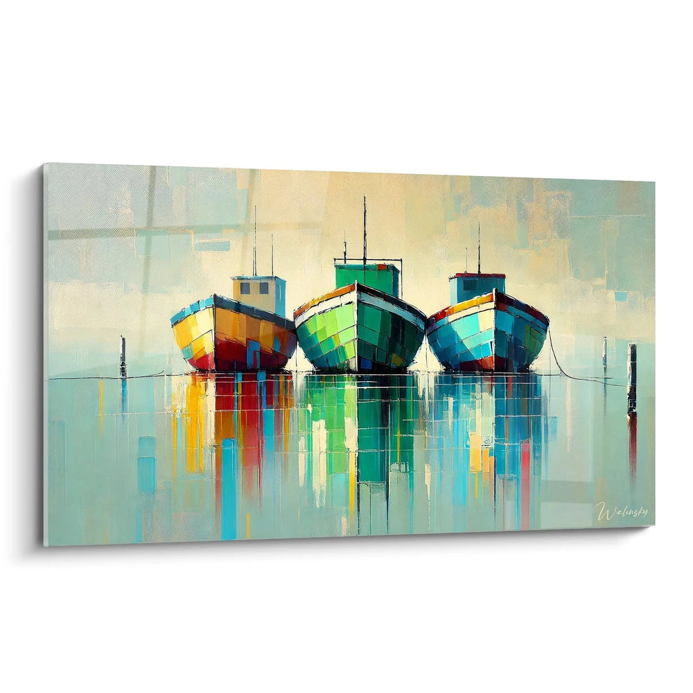Chaque touche de couleur — jaune éclatant, vert vibrant, bleu profond — est pensée pour éveiller en vous un sentiment de joie et d’équilibre. L’énergie dynamique de ce tableau illumine votre espace, insufflant vitalité et fraîcheur. En même temps, l’harmonie parfaite des reflets apaise le regard, offrant une oasis de calme dans le tumulte du quotidien. L’alignement précis des bateaux et leur design contemporaine évoquent une symphonie visuelle où simplicité rime avec élégance.