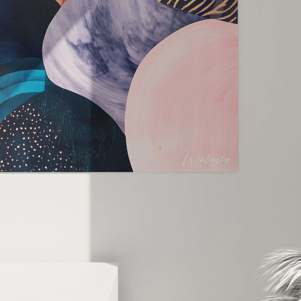 La palette chromatique révèle une sophistication remarquable avec ses tonalités douces et contrastées. Les roses poudrés dominent l'ensemble, accompagnés de bleus profonds marine et de cuivres métalliques chaleureux. Cette décoration murale abstraite rose intègre également des violets nuancés et des turquoises subtils qui apportent fraîcheur et modernité.
