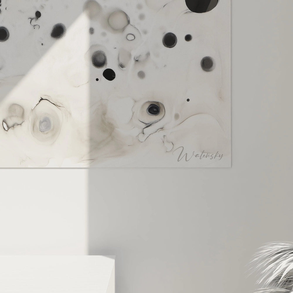 Ce tableau abstrait tacheté se distingue par sa composition dynamique d'éclaboussures noires et grises sur fond blanc immaculé. L'œuvre présente un équilibre parfait entre chaos contrôlé et harmonie visuelle, créant une expérience contemplative unique. Les taches de différentes tailles créent un rythme visuel captivant, allant de micro-projections à de larges aplats circulaires. Cette décoration murale abstraite moderne évoque à la fois l'univers cosmique et la gestuelle artistique spontanée. L'effet global génère une sensation de mouvement perpétuel, comme si les éléments étaient suspendus dans l'espace-temps.