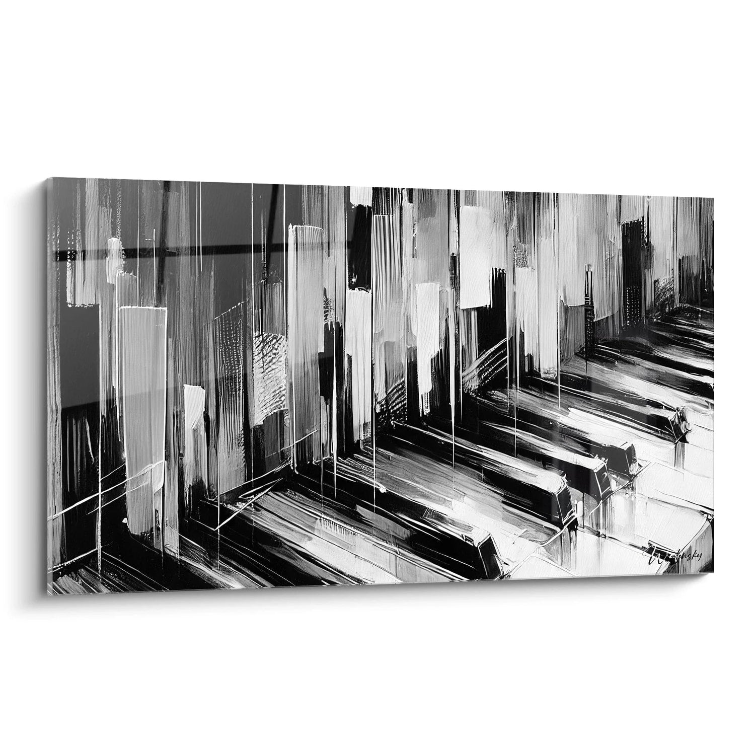 Ce tableau transcende simplement la décoration : il résonne comme une partition visuelle, mêlant profondeur et pureté. Les lignes verticales rythment la toile telle une symphonie de mains courant sur un clavier. Le contraste élégant du noir et blanc joue avec la lumière et l’ombre, tandis que les nuances subtiles de gris tissent une ambiance d’équilibre parfait. Chaque coup de pinceau incarne la fluidité entre la puissance d’un crescendo et la douceur d’un pianissimo, créant un spectacle sensoriel captivant.