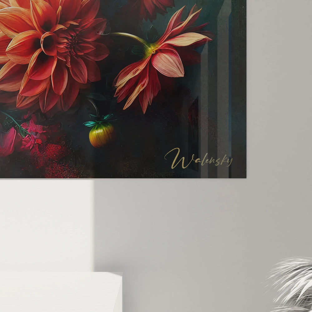 Ce tableau ne se contente pas de décorer vos murs, il vous plonge dans une expérience immersive. Les dahlias, avec leurs formes délicates et théâtrales, dansent entre ombre et lumière, créant un effet presque palpable. Vous sentez la chaleur des rouges profonds, l'énergie passionnée des oranges ardents et la noblesse des bruns veloutés, des couleurs qui embrassent votre regard et réchauffent votre atmosphère intérieure.