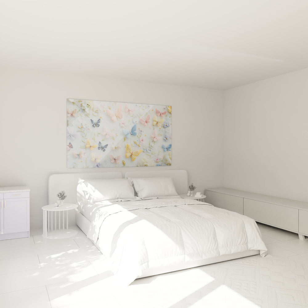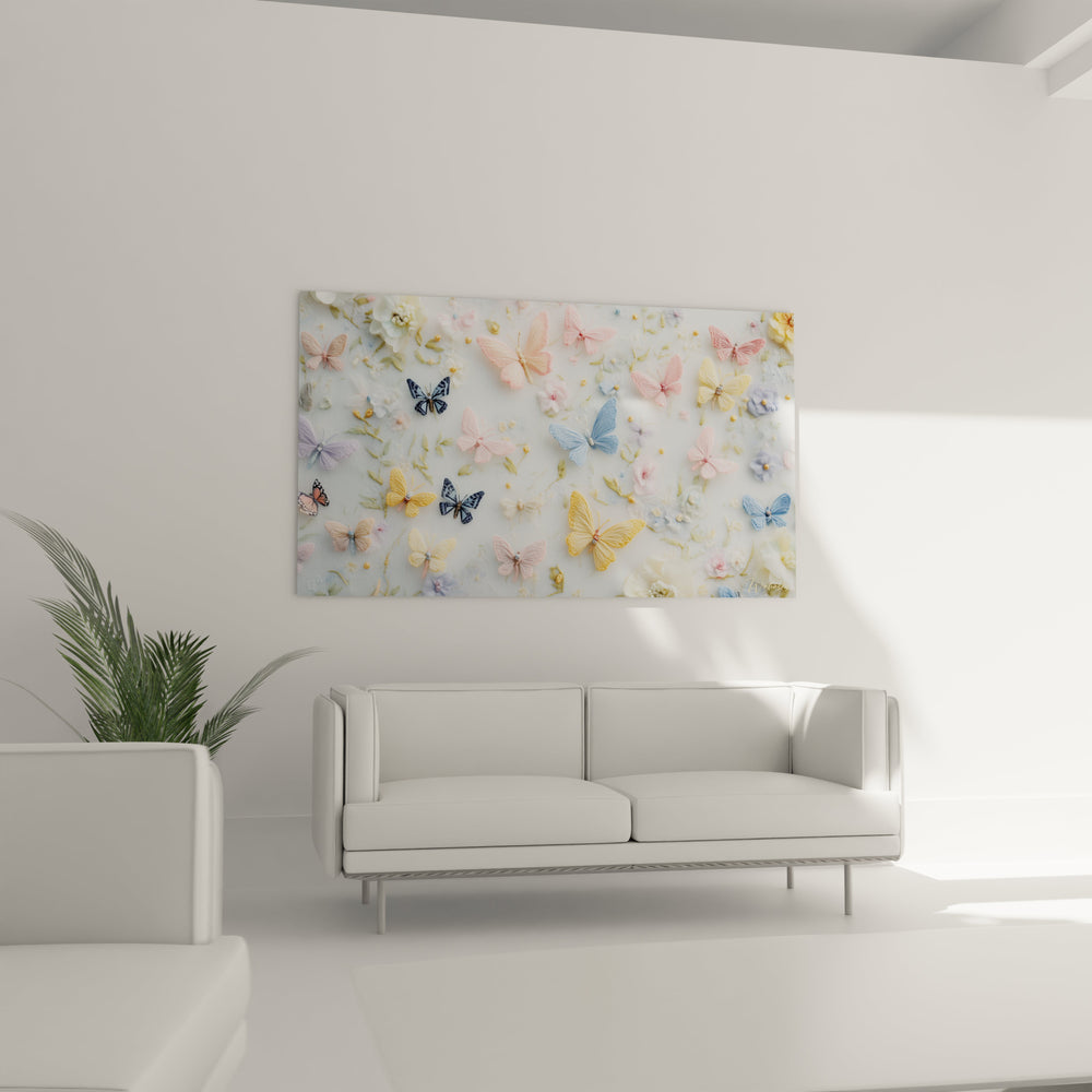 La palette chromatique de ce tableau papillons se déploie en teintes pastel délicates et harmonieuses. Le fond blanc-bleuté très doux sert de toile parfaite pour mettre en valeur les papillons aux couleurs variées. On observe une dominance de roses tendres dans plusieurs nuances, complétés par des bleus ciel apaisants, des jaunes pâles lumineux et quelques accents de bleu marine qui apportent profondeur et contraste.