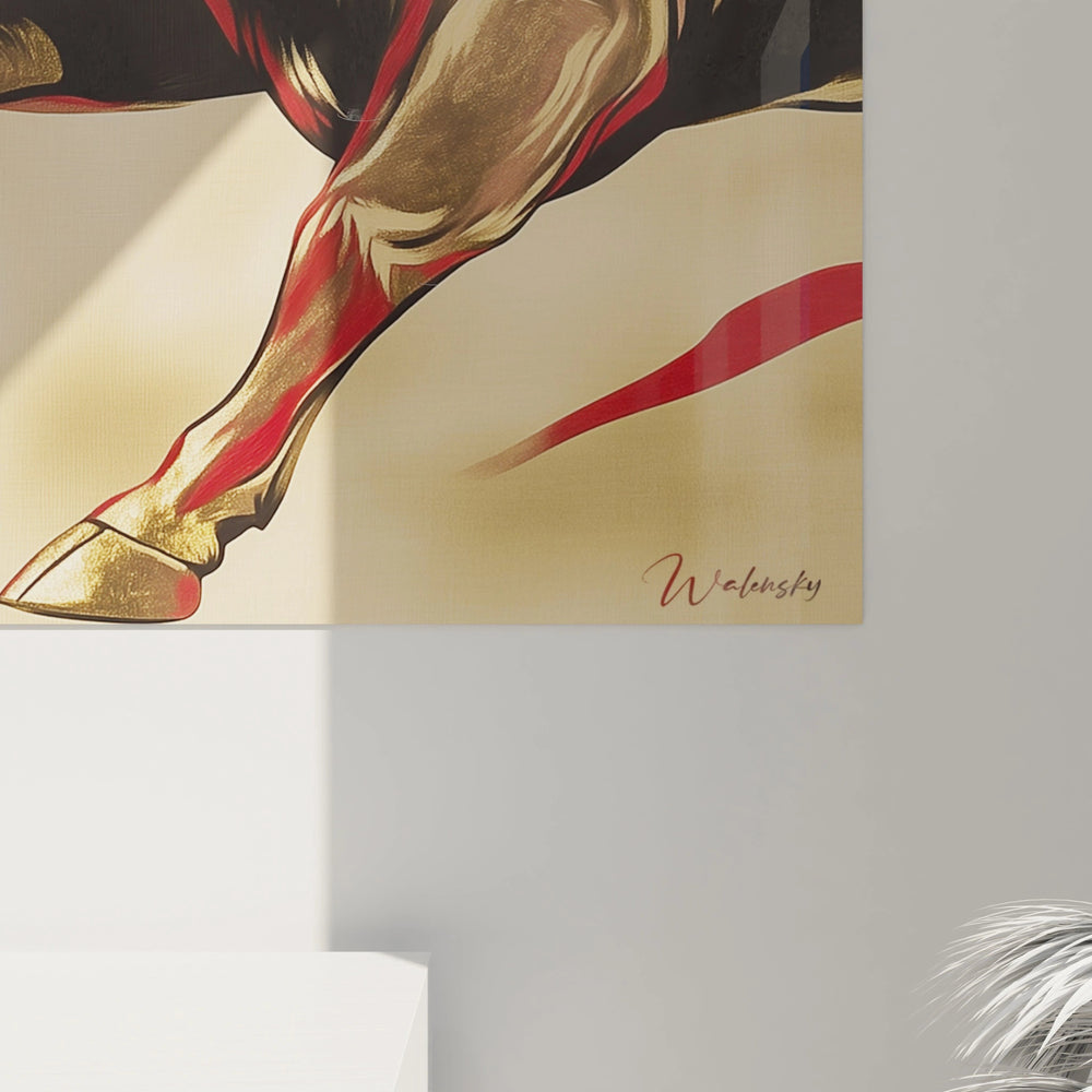 Ces tonalités créent un contraste saisissant entre la chaleur du doré et l'intensité du rouge, évoquant à la fois la puissance tellurique et la passion ardente. Cette art mural taureau exploite brillamment ces harmonies pour créer une atmosphère à la fois majestueuse et énergique, où chaque nuance contribue à l'impact émotionnel global de l'œuvre.