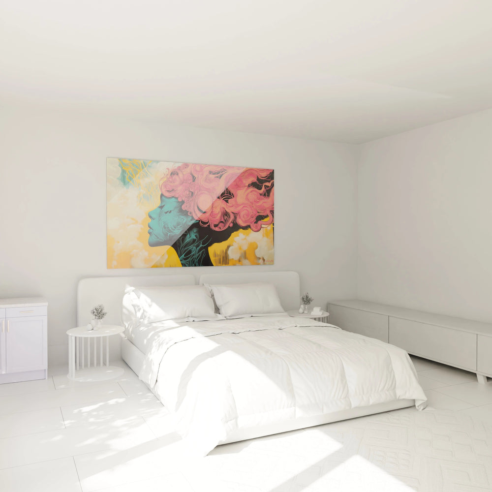 Ce tableau visage psychédélique captive instantanément par son contraste saisissant entre un profil turquoise et une explosion capillaire rose-corail. Le portrait stylisé présente une femme au profil élégant dont les pensées semblent se matérialiser en volutes tourbillonnantes. L'arrière-plan doré et nuageux crée une atmosphère onirique qui amplifie l'impact visuel de cette œuvre contemporaine. Les lignes fluides et la composition décentrée confèrent une dynamique puissante à ce tableau visage expressif.