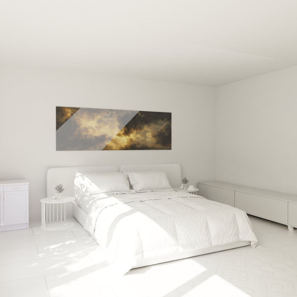 Imaginons un instant : vous entrez dans une pièce ornée de ce tableau captivant, et immédiatement, vos yeux sont attirés par les éclairs dorés qui dansent parmi les nuages. Ces nuances délicates évoquent une tempête, mais d'une manière élégante et stylisée, créant une atmosphère à la fois apaisante et inspirante. Ce tableau est une véritable invitation à la contemplation.