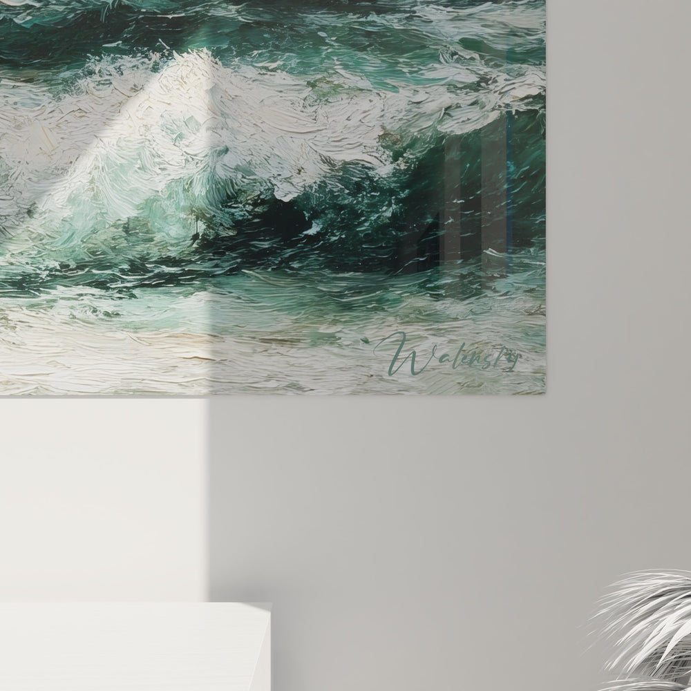 La symbolique maritime de cette œuvre évoque la dualité entre fascination et respect devant la puissance océanique. La palette chromatique dominée par les verts profonds de la mer contraste avec les blancs éclatants de l'écume, symbolisant l'éternelle lutte entre ordre et chaos. Les tons terreux du ciel orageux renforcent l'atmosphère dramatique de ce tableau décoration marine.
