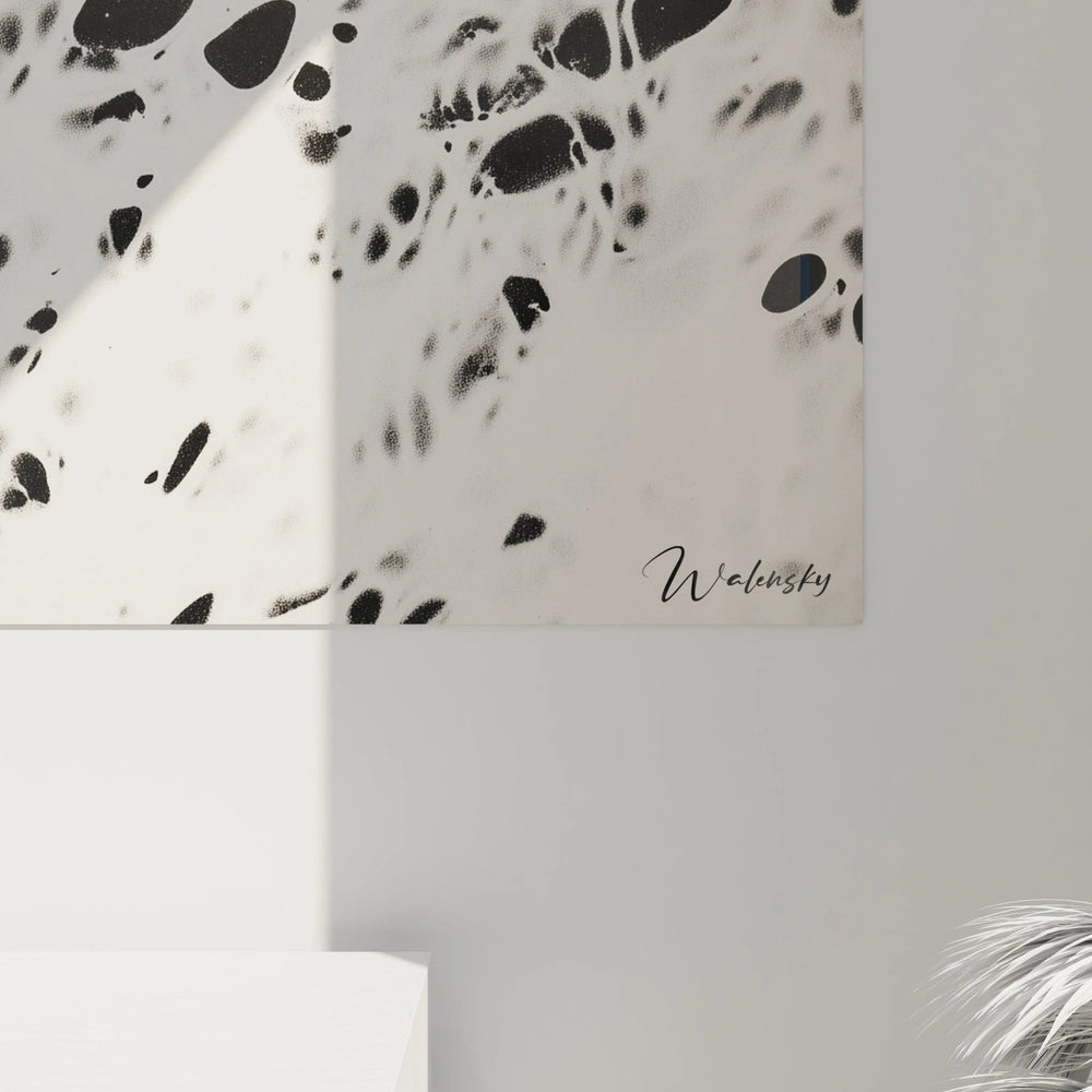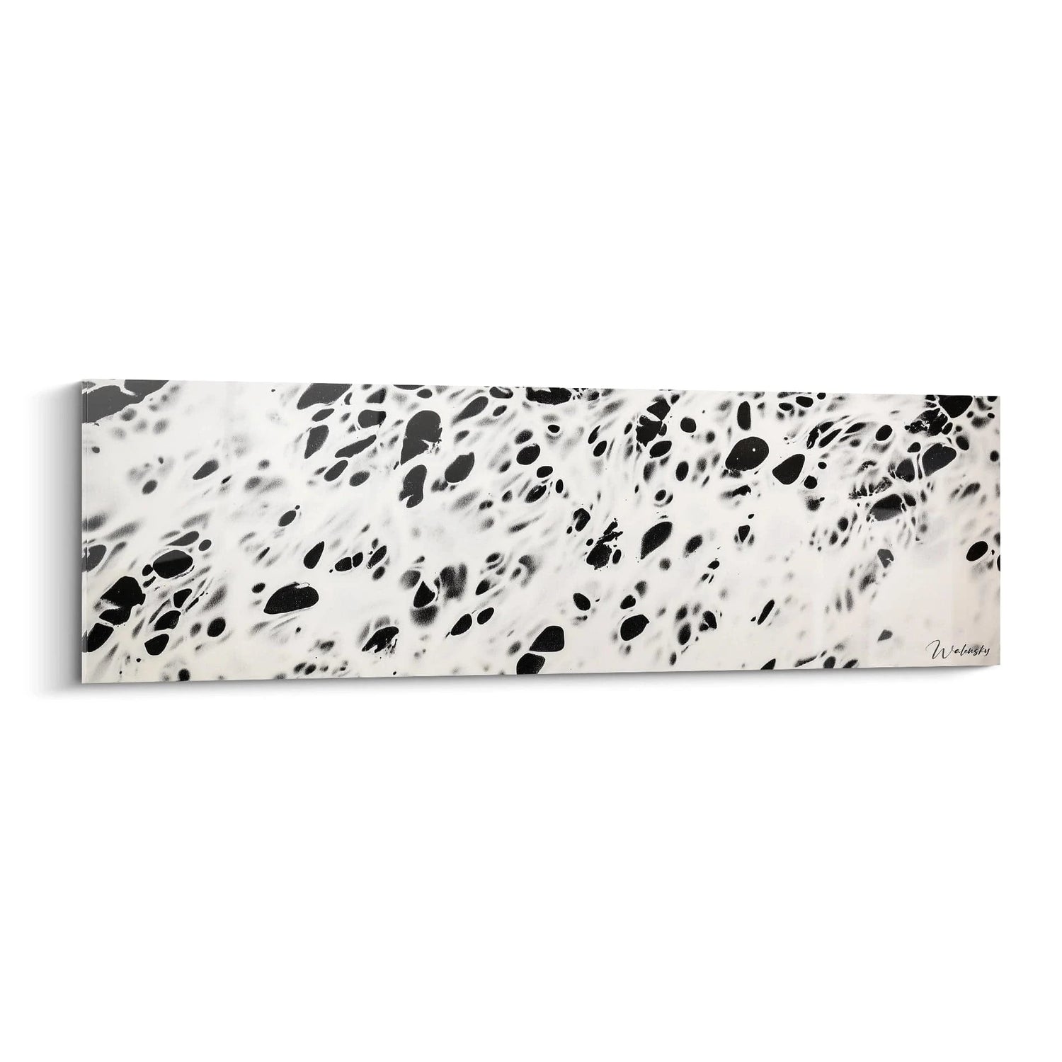 Ce tableau tacheté noir et blanc se distingue par sa composition abstraite dynamique où des éclaboussures et projections d'encre noire dansent sur un fond blanc immaculé. L'œuvre révèle un mouvement organique spontané, évoquant à la fois la liberté créative et la beauté du hasard contrôlé. Ce tableau éclaboussure moderne capture l'essence du mouvement expressionniste contemporain avec ses formes irrégulières qui semblent défier la gravité. La répartition aléatoire des taches crée une harmonie visuelle surprenante, transformant le chaos apparent en équilibre esthétique raffiné.