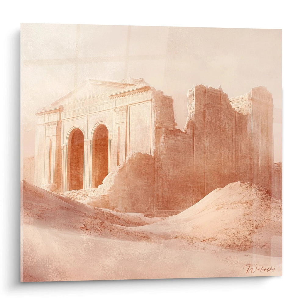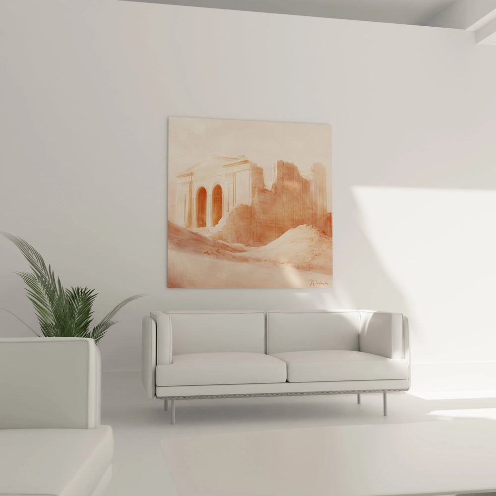 Ce tableau temple révèle une architecture antique majestueuse émergent des sables dorés du désert. L'œuvre capture un temple aux colonnes élégantes, dont les arcs en plein cintre évoquent la grandeur de civilisations perdues. Les ruines environnantes témoignent du passage du temps, créant un contraste saisissant avec la structure principale encore debout. Cette décoration murale temple antique transporte immédiatement l'observateur dans un monde de mystère et de spiritualité. Les tons ocre et sable dominent la composition, conférant une atmosphère chaleureuse et intemporelle à l'ensemble.