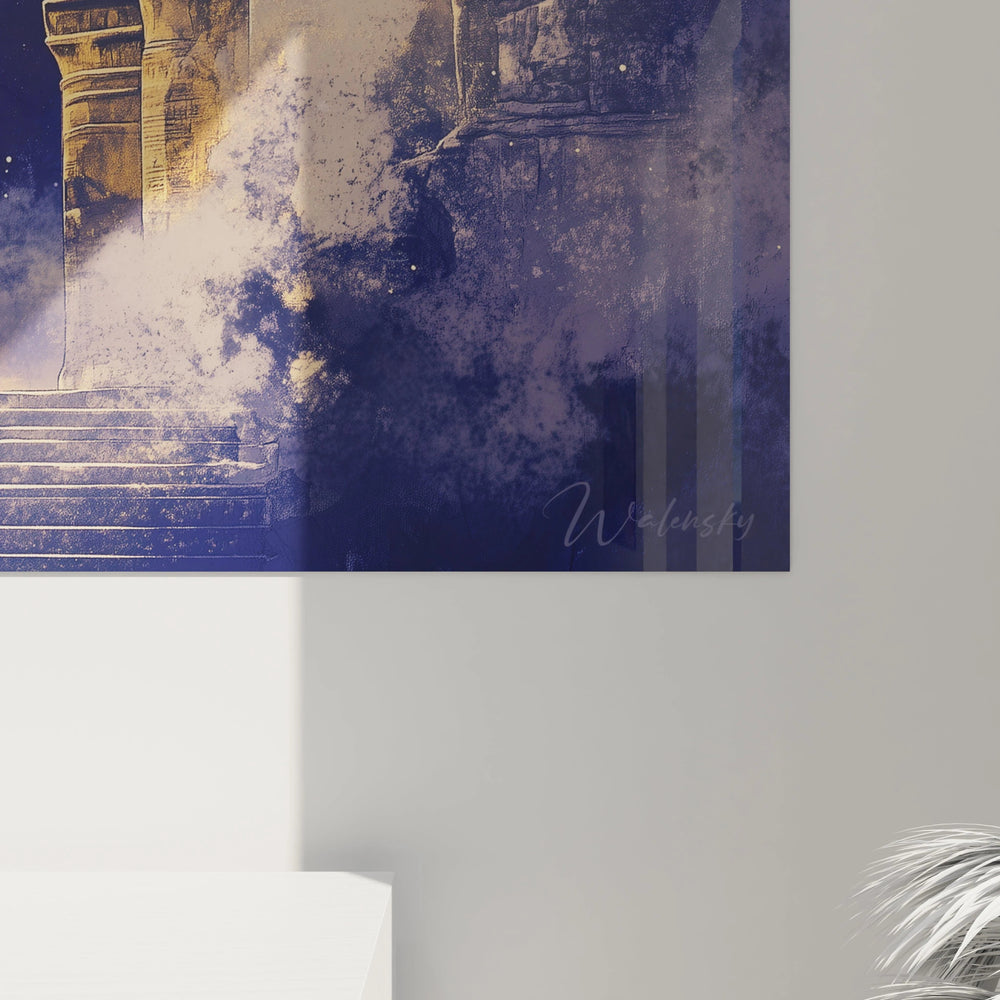 Cette œuvre d'art représente un tableau temple égyptien d'une beauté saisissante, où les colonnes antiques se dressent majestueusement sous un ciel nocturne parsemé d'étoiles dorées. Le tableau temple mystique capture l'essence de l'Égypte ancienne avec ses structures architecturales imposantes baignées dans une lumière dorée. Les détails minutieux des chapiteaux et des fûts révèlent la grandeur de cette civilisation millénaire. Cette décoration murale temple transporte immédiatement l'observateur dans l'univers fascinant des pharaons, créant une atmosphère à la fois mystérieuse et solennelle.