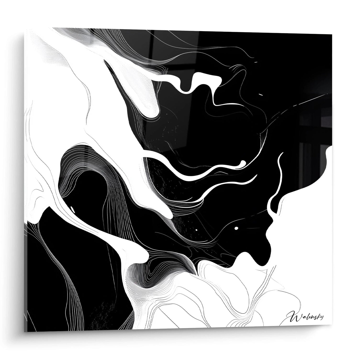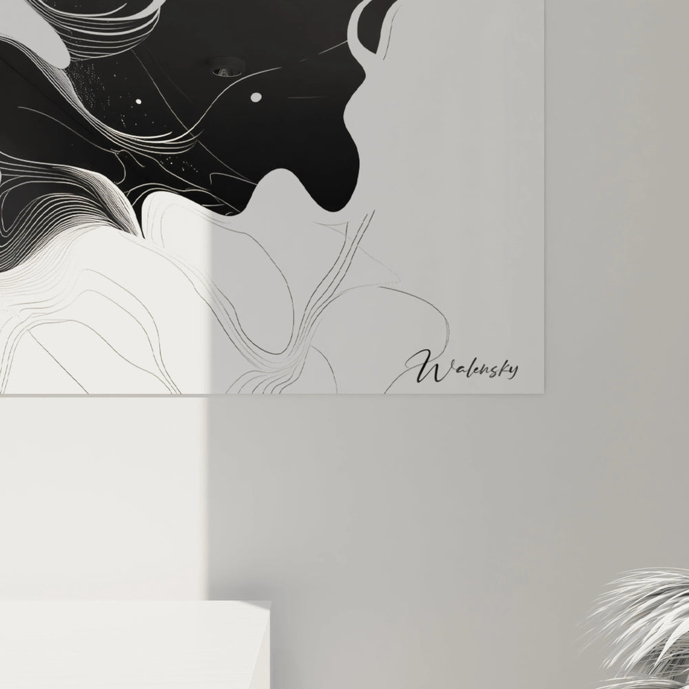 Avec sa palette épurée, ce tableau exhale une élégance intemporelle. Le noir, le blanc et les nuances de gris se répondent avec finesse, mettant en valeur les formes organiques qui épousent le cadre avec légèreté et tension simultanée. Chaque trait invite à la contemplation, chaque courbe ouvre l'imaginaire et vous transporte vers un espace mental où le temps semble suspendu. L’effet est aussi visuel qu’émotionnel, exprimant une dualité profonde qui fait vibrer votre intérieur de manière subtile mais puissante.