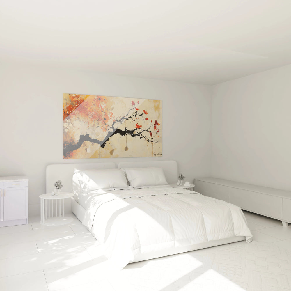 Ce tableau ne se contente pas d’habiller un mur : il raconte un récit inspirant, celui de la nature qui lutte, évolue et s’adapte au fil des saisons. Les nuances ardentes d’orange et de rouge s’entremêlent aux noirs intenses, évoquant à la fois la fragilité et la vitalité des paysages sauvages. Laissez-vous transporter par la sensation d’un crépuscule doré où la terre, les feuillages et le bois noueux dialoguent en silence.