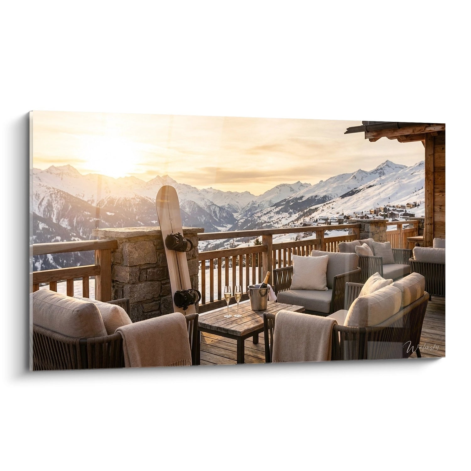 Ce tableau captivant nous transporte sur la terrasse d'un chalet de luxe niché au cœur des Alpes enneigées. L'image révèle un espace de détente sophistiqué où le confort moderne rencontre l'authenticité montagnarde. Au premier plan, des fauteuils moelleux aux coussins beiges invitent à la relaxation, disposés autour d'une table basse en bois où trône une bouteille de champagne dans son seau à glace. Cette scène d'après-ski de prestige évoque les moments privilégiés passés entre amis ou en famille après une journée sur les pistes. La présence discrète mais symbolique d'un snowboard appuyé contre la rambarde en bois rappelle la passion des sports d'hiver qui anime ce lieu d'exception. L'architecture traditionnelle du chalet, avec ses poutres apparentes et sa rambarde sculptée, s'harmonise parfaitement avec le mobilier contemporain, créant une atmosphère chaleureuse et raffinée. Ce tableau incarne l'art de vivre à la montagne, où le luxe discret se mêle aux plaisirs simples de la nature alpine.