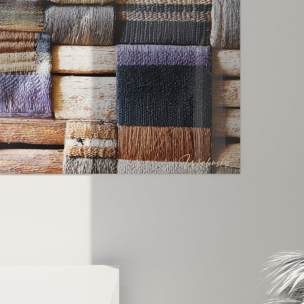 Ce tableau mural textiles artisanaux présente une remarquable collection de tissus africains traditionnels disposés en mosaïque harmonieuse. L'œuvre révèle la richesse du patrimoine textile d'Afrique à travers une diversité impressionnante de techniques de tissage et de motifs géométriques. Chaque échantillon de tissu traditionnel africain raconte une histoire unique, depuis les fibres naturelles teintes aux colorants végétaux jusqu'aux motifs symboliques transmis de génération en génération. Les textiles ethniques africains présentés incluent des tissages fins aux rayures délicates, des motifs à chevrons caractéristiques, et des textures variées allant du lin naturel aux cotons épais. Cette collection de tissus d'Afrique authentiques met en lumière l'expertise des artisans locaux et leur maîtrise des techniques ancestrales. Le tableau décoratif tissus africains capture parfaitement la diversité culturelle du continent à travers ces échantillons soigneusement sélectionnés et arrangés sur support en bois naturel, créant un véritable art mural textile africain contemporain.