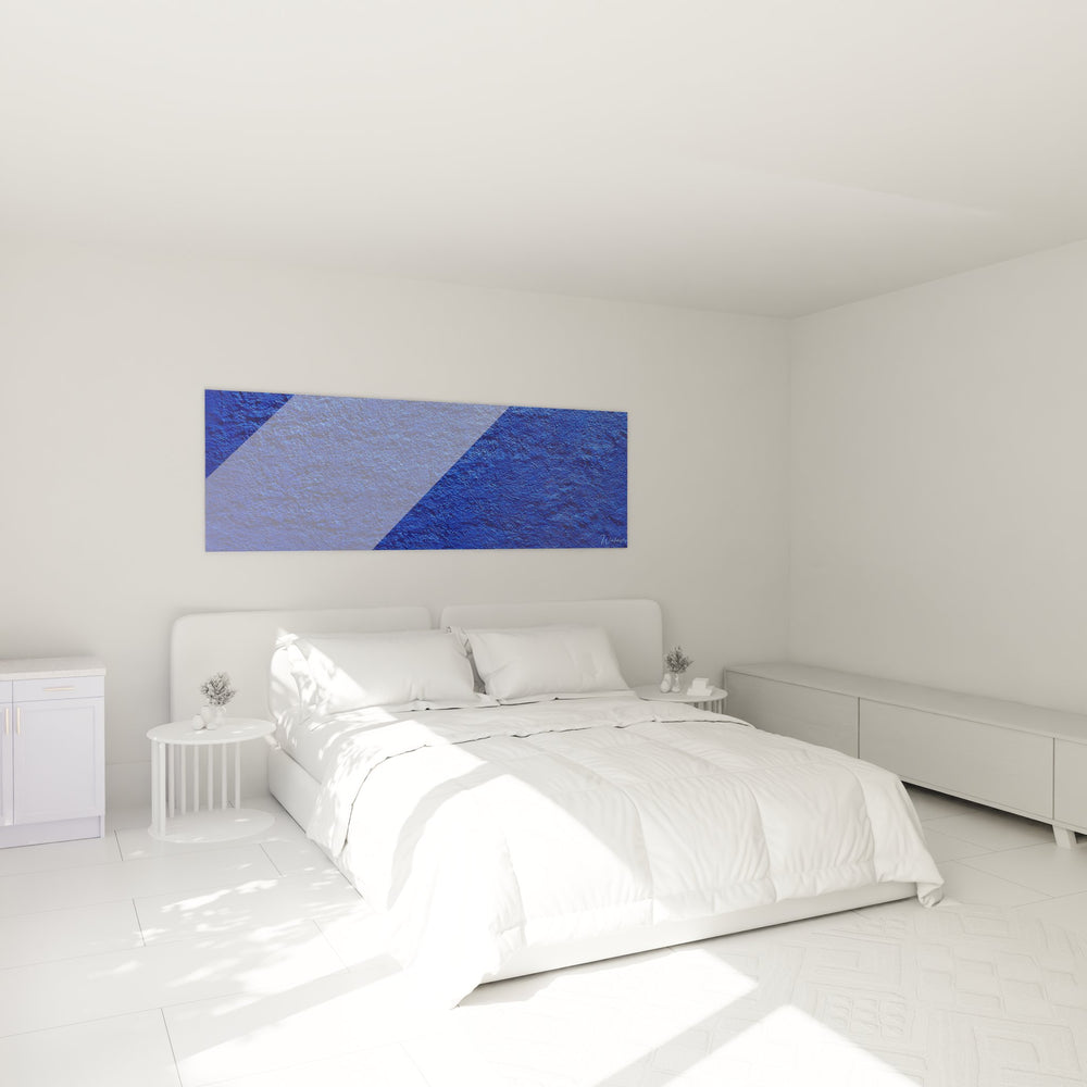 La dominante bleue de cette œuvre abstraite contemporaine véhicule des symboliques puissantes liées à la sérénité, à la profondeur spirituelle et à l'infini océanique. Les variations chromatiques du bleu, du plus clair au plus sombre, créent une harmonie colorielle apaisante qui favorise la détente et la méditation. Cette palette monochrome sophistiquée s'adapte parfaitement aux intérieurs modernes en quête d'élégance et de raffinement.