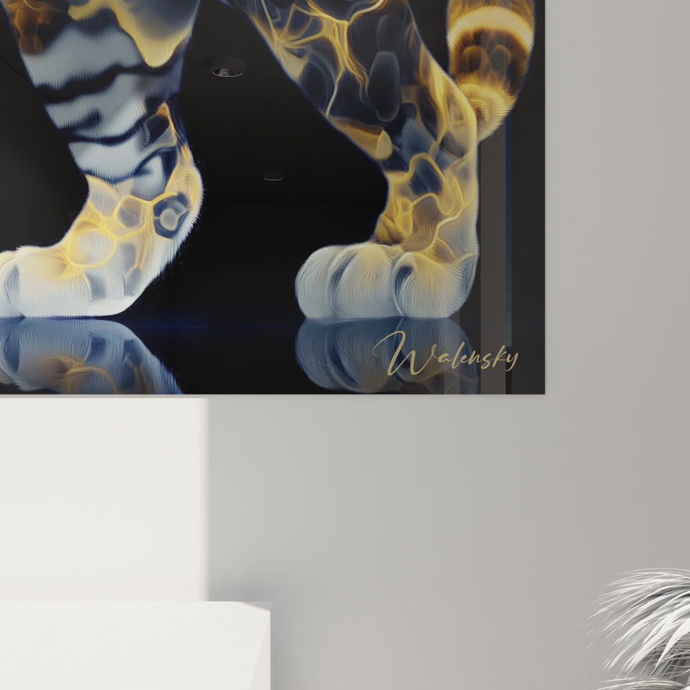 Ce tableau mural tigre à dent de sabre présente une interprétation artistique saisissante du légendaire smilodon, immortalisé dans une composition aux effets luminescents dorés spectaculaires. L'œuvre révèle la silhouette puissante du félin préhistorique dans une approche moderne et futuriste, où les contours du prédateur semblent sculptés par une lumière dorée incandescente. Les canines surdimensionnées caractéristiques de cette espèce éteinte sont magnifiées par des jeux de transparence et d'opacité qui créent une profondeur visuelle remarquable. Le tigre à dent de sabre artistique se dresse avec une prestance naturelle, capturant l'essence sauvage et la force brute de ce chasseur légendaire. Les motifs tachetés lumineux qui parcourent son pelage évoquent à la fois la beauté naturelle du félin et une dimension quasi-mystique. Cette représentation moderne du smilodon transforme l'animal préhistorique en icône contemporaine, mêlant réalisme anatomique et créativité artistique. Le tableau décoratif fauve préhistorique s'impose comme une pièce maîtresse capable de transformer n'importe quel espace en galerie d'art personnelle, offrant une perspective unique sur l'un des prédateurs les plus fascinants de l'histoire naturelle.