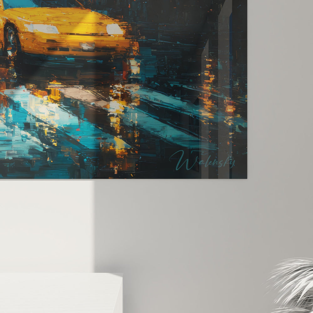 Ce tableau mural Times Square capture magistralement l'essence de la célèbre intersection new-yorkaise sous une pluie nocturne. L'artiste a su retranscrire l'atmosphère électrique de cette scène urbaine iconique où les taxis jaunes emblématiques naviguent dans un dédale de lumières et de reflets. La composition présente une perspective saisissante de l'avenue, ponctuée par les silhouettes caractéristiques des gratte-ciels illuminés et des enseignes lumineuses publicitaires qui font la renommée de Times Square. Les véhicules, principalement des taxis yellow cab, créent un mouvement dynamique au premier plan, leurs phares perçant la pénombre humide. Cette peinture urbaine contemporaine révèle la beauté cachée de la métropole sous la pluie, transformant les reflets sur l'asphalte mouillé en un véritable spectacle lumineux. L'artiste a particulièrement soigné les jeux de lumière qui se reflètent sur la chaussée, créant une profondeur visuelle remarquable. Cette œuvre d'art New York témoigne de l'énergie perpétuelle de la ville qui ne dort jamais, même sous les intempéries. Les détails architecturaux des buildings environnants sont subtilement suggérés, permettant au spectateur de reconnaître instantanément ce paysage urbain mythique de Manhattan.