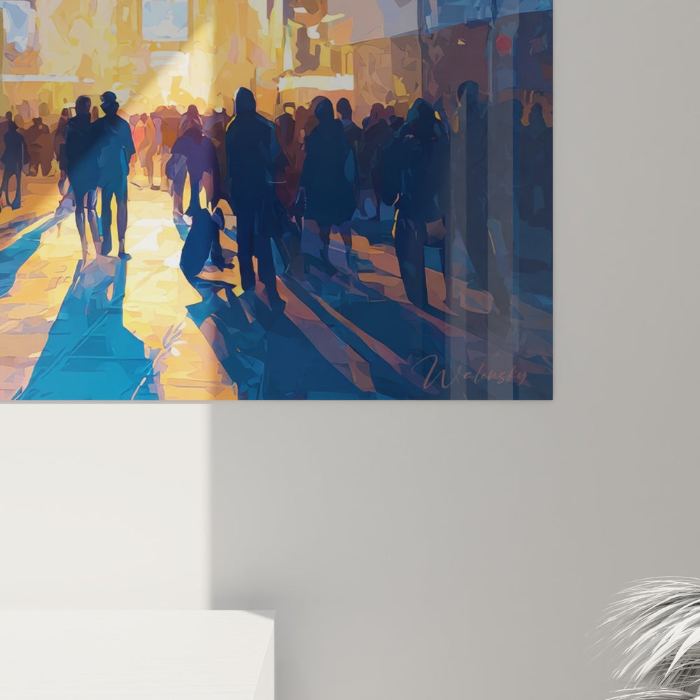 Ce tableau Times Square urbain capture toute l'effervescence de l'emblématique carrefour new-yorkais dans un style artistique contemporain. L'œuvre représente la célèbre intersection de Broadway avec ses gratte-ciel illuminés qui s'élèvent majestueusement vers le ciel. Les écrans publicitaires géants et les enseignes lumineuses créent un kaléidoscope de couleurs vives qui baignent la scène d'une lumière chaleureuse. Au premier plan, une foule de silhouettes se déplace dans cette atmosphère électrique, évoquant le mouvement perpétuel de la ville qui ne dort jamais. Ce tableau mural New York retranscrit parfaitement l'énergie urbaine de Manhattan avec ses néons colorés qui se reflètent sur le bitume mouillé. L'artiste a su saisir cette ambiance nocturne Times Square si caractéristique, où touristes et new-yorkais se mêlent dans un ballet incessant. Les buildings iconiques encadrent la composition, créant cette sensation d'être au cœur de la Big Apple. Cette décoration murale urbaine apportera une touche moderne et dynamique à votre intérieur, rappelant la magie de cette métropole américaine légendaire.