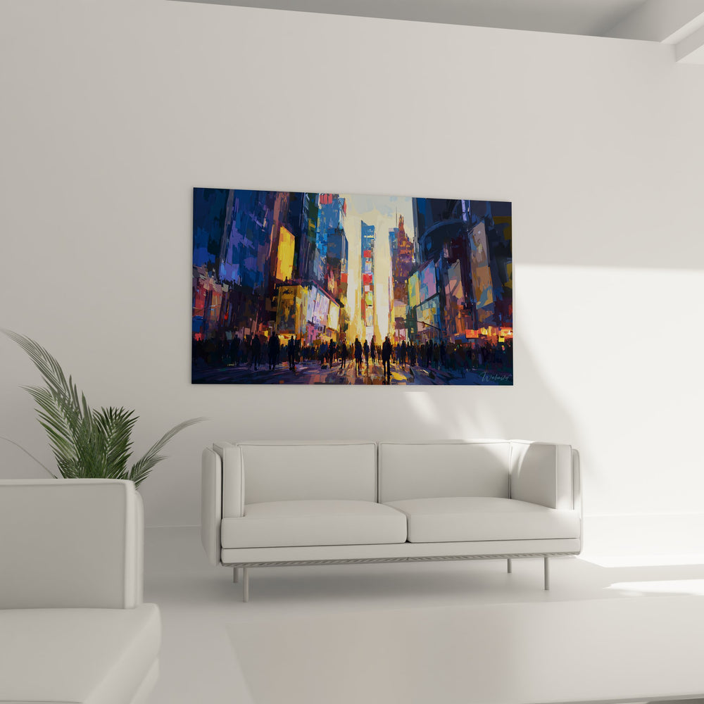 Ce tableau mural Times Square capture l'essence vibrante de l'iconique place new-yorkaise dans un style artistique contemporain saisissant. L'œuvre présente une peinture urbaine moderne où les gratte-ciels de Manhattan s'élèvent majestueusement vers un ciel lumineux, créant une perspective dramatique au cœur de la célèbre intersection. Les couleurs vives et contrastées dominent la composition : des bleus profonds structurent les façades des immeubles tandis que des oranges chaleureux et des jaunes éclatants illuminent les enseignes publicitaires et l'atmosphère urbaine. La foule anonyme au premier plan, représentée par des silhouettes sombres, accentue l'effet de profondeur et l'animation perpétuelle de ce quartier emblématique de New York. Cette œuvre d'art murale contemporaine traduit parfaitement l'énergie électrisante de Times Square, entre modernité architecturale et effervescence commerciale. Les techniques de peinture impressionniste digitale utilisées créent un effet de mouvement et de dynamisme, où chaque coup de pinceau virtuel semble capturer l'instant fugace d'une métropole en perpétuelle mutation. Ce tableau décoratif urbain transformera instantanément votre espace en lui apportant toute la vitalité et le caractère cosmopolite de la Big Apple.