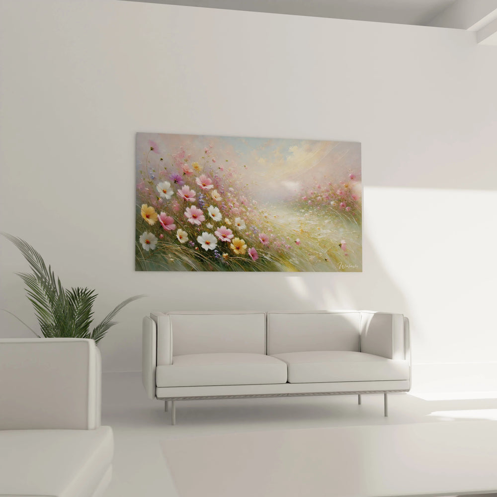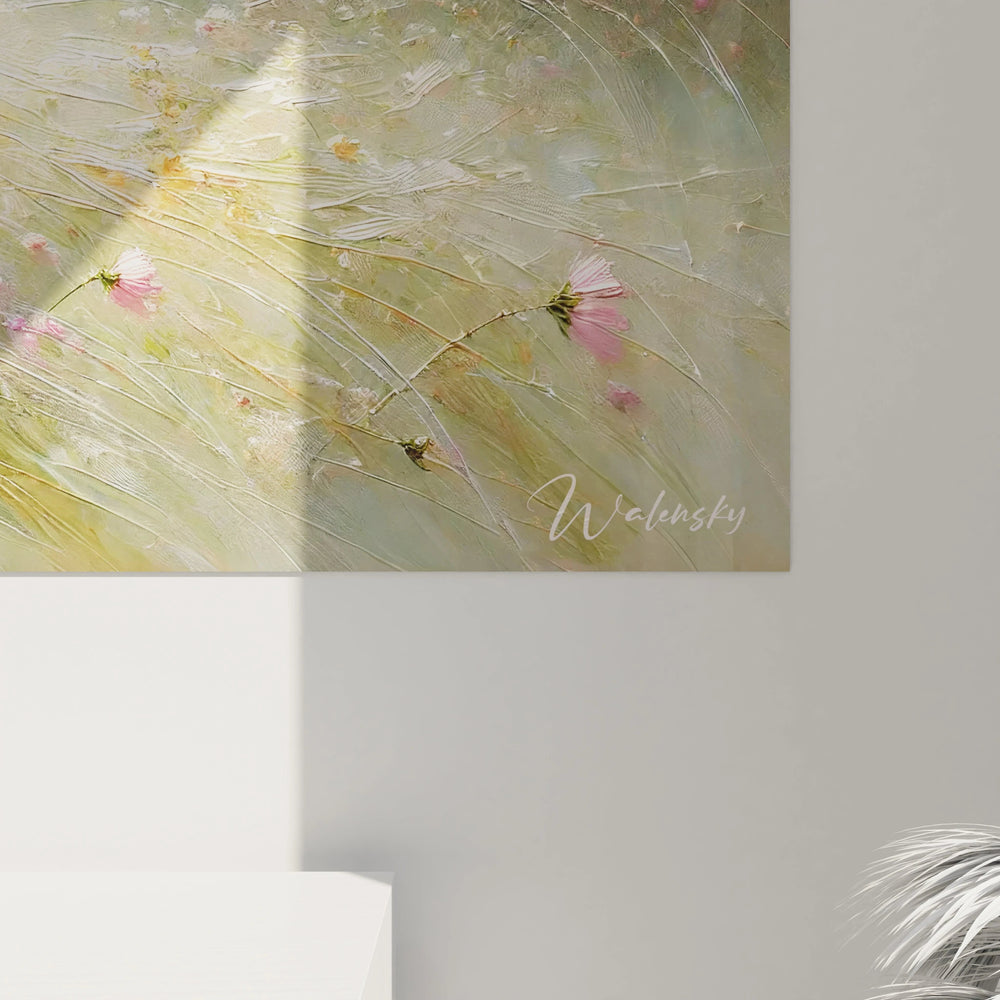 Imaginez-vous marchant à travers une prairie aux couleurs tendres, où les pétales encore baignés de rosée captent la lumière avec une douceur presque palpable. La toile capte cette magie éphémère, offrant un spectacle visuel qui apaise et invite à la rêverie. Les nuances délicates de rose, de blanc crémeux et de jaune pâle enveloppent votre pièce d’une aura chaleureuse et élégante, évoquant la renaissance et la douceur d’un printemps naissant.