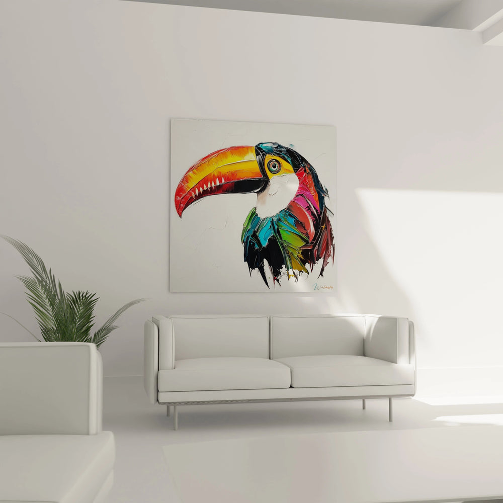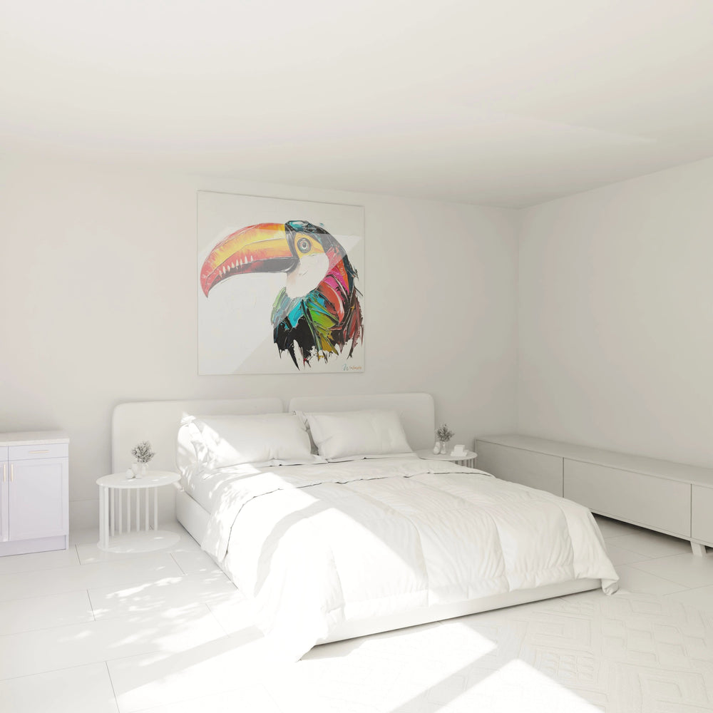 Cette œuvre trouve sa place idéale dans des espaces contemporains où ses couleurs vives peuvent s'exprimer pleinement. L'éclairage naturel révèle toute la richesse chromatique, particulièrement en lumière douce du matin. Les murs blancs ou neutres constituent le fond parfait pour mettre en valeur ce tableau toucan décoratif. L'œuvre s'harmonise parfaitement avec des intérieurs aux tons naturels, des matériaux comme le bois clair ou la pierre. Cette décoration murale toucan moderne peut être associée à d'autres œuvres de la même série ou à des éléments décoratifs aux couleurs complémentaires. L'installation à hauteur des yeux permet d'apprécier pleinement l'expression du regard et les détails du plumage.