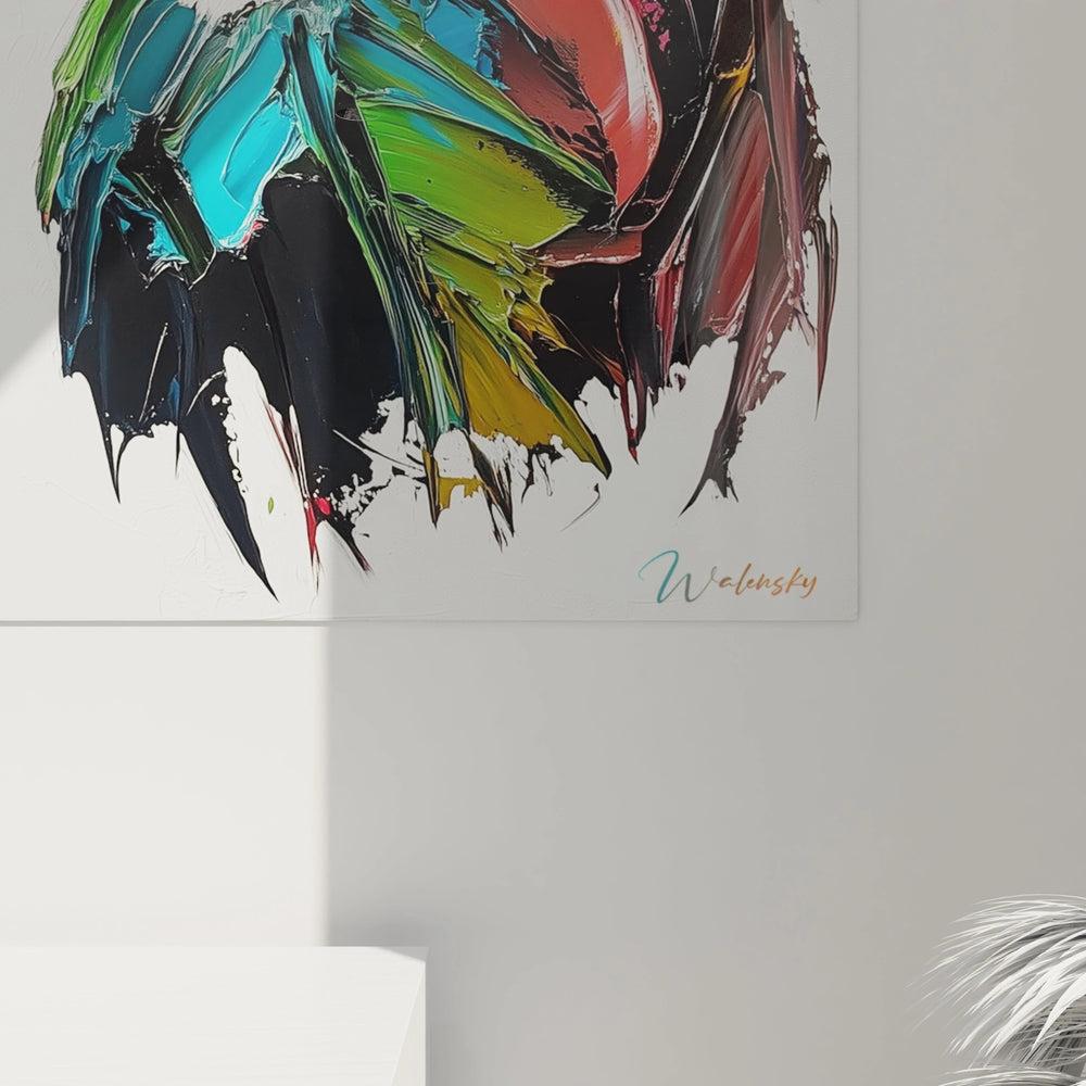 Cette œuvre se distingue par son approche expressionniste qui privilégie l'émotion et la couleur sur la reproduction fidèle. L'artiste a créé un toucan stylisé dont l'œil agrandi exprime une présence intense et bienveillante. Le traitement du bec en dégradé flamboyant constitue l'élément signature de cette création. Cette art mural toucan original présente des caractéristiques impossibles à reproduire : la spontanéité des gestes, l'équilibre unique des couleurs et la personnalité expressive de l'oiseau. Le tableau toucan artistique révèle une interprétation personnelle qui transforme l'animal en icône décorative moderne. L'aspect inachevé volontaire de certaines zones contraste avec la précision d'autres détails, créant un rythme visuel captivant.