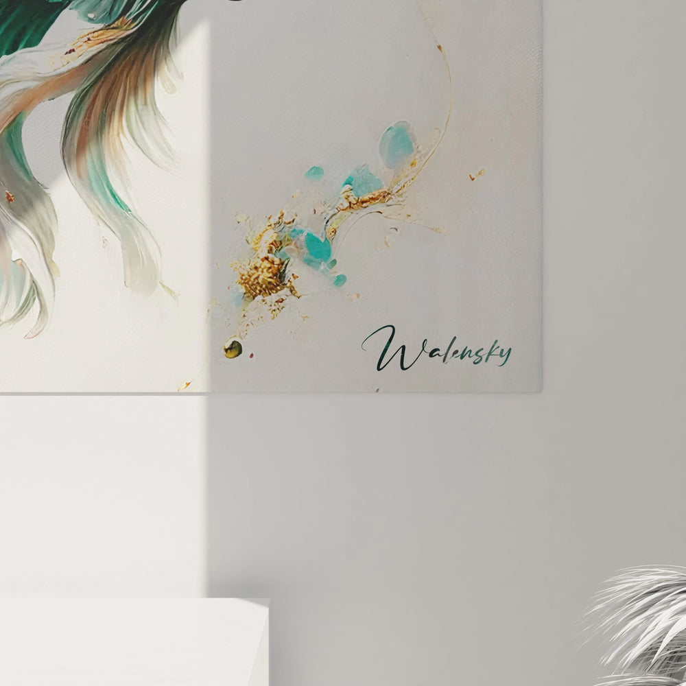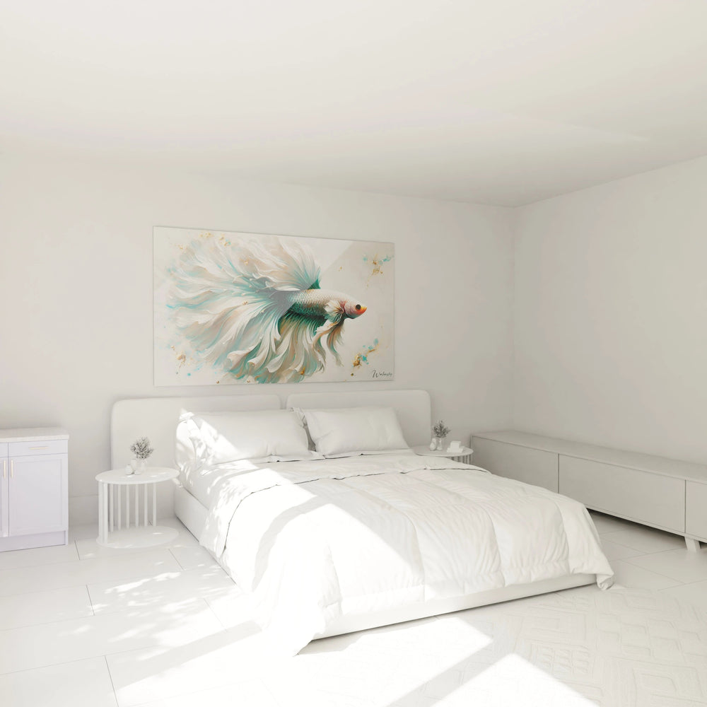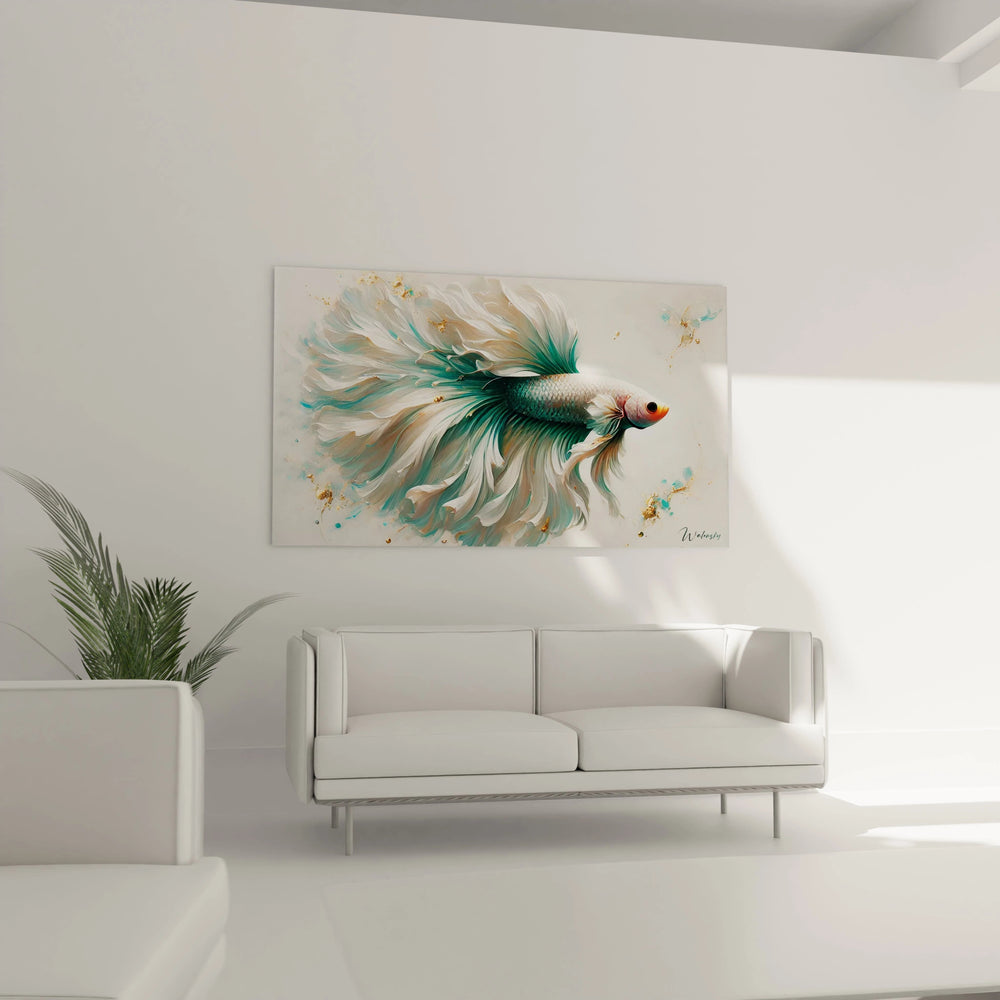 Chaque détail de ce tableau capture la délicatesse des mouvements du poisson betta, ses nageoires délicatement étirées semblant danser avec les courants imaginaires d'une mer tranquille. La palette de verts et de turquoises, rehaussée de touches dorées, évoque la pureté cristalline de l’eau, tandis que le contraste subtil avec le blanc éclaire l’ensemble d’une lumière douce et vibrante. Cette harmonie chromatique transforme instantanément votre espace en un havre de paix luxueux.