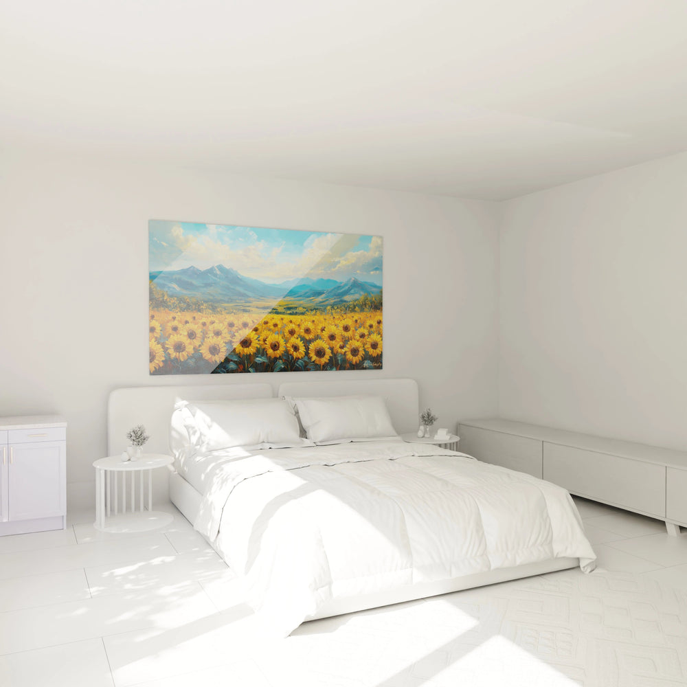À distance, ce tableau tournesols décoration moderne offre une impression d'ensemble harmonieuse où les couleurs vibrantes créent un impact visuel immédiat. L'œil est naturellement attiré par le contraste entre la chaleur des tournesols et la fraîcheur des montagnes. En s'approchant, on découvre la richesse des détails : chaque fleur possède sa propre texture, les variations subtiles dans les teintes de jaune, et les nuances infinies dans le traitement des sommets montagneux.