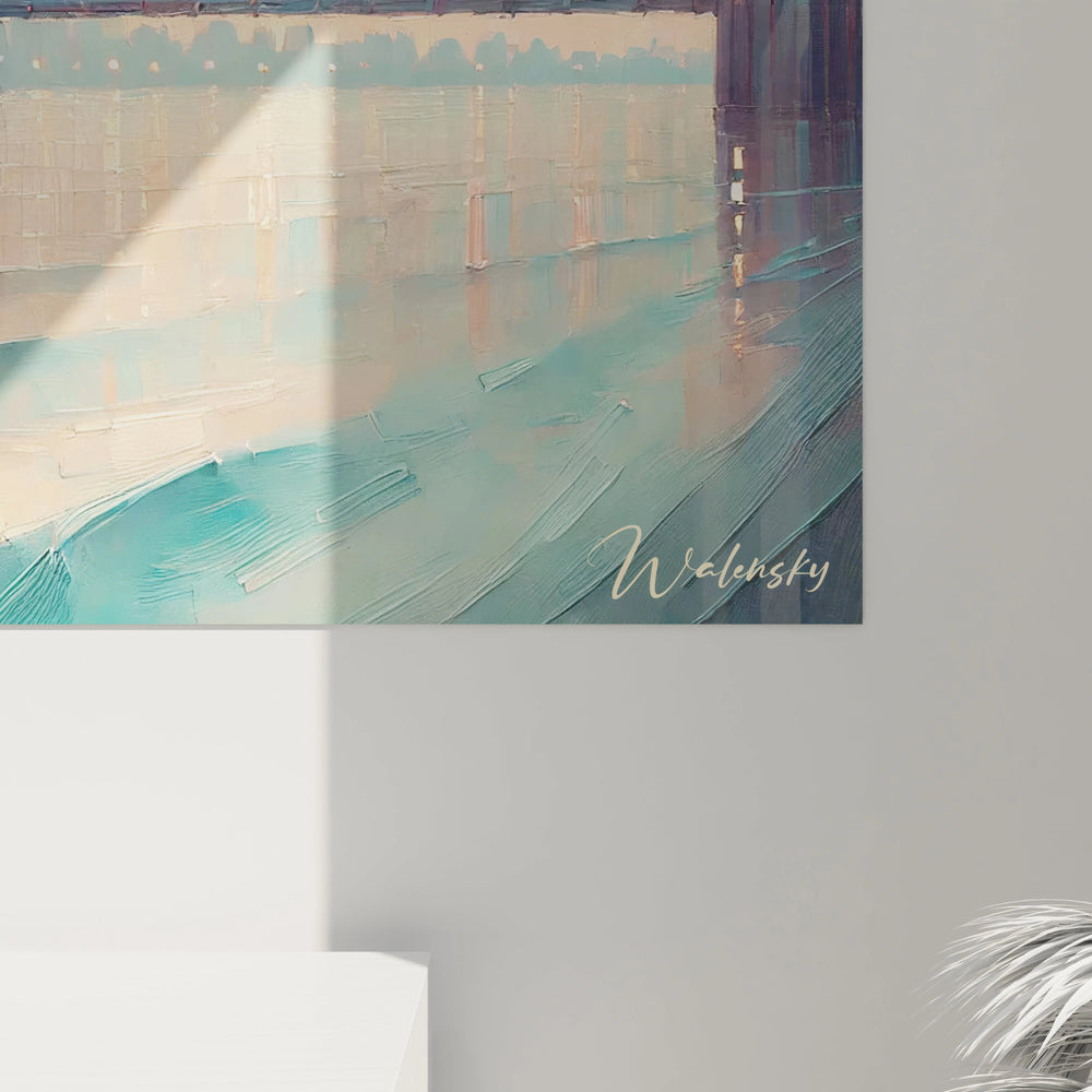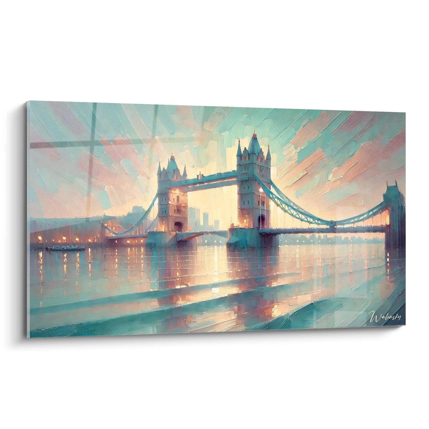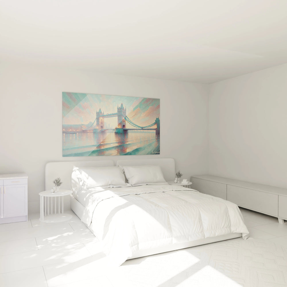 Imaginez le spectacle unique des tours du Tower Bridge s’élevant fièrement, baignées par une lumière douce qui semble suspendue hors du temps. Chaque coup de pinceau traduit cette atmosphère sereine, mêlant des teintes beige apaisantes, des nuances profondes de bleu et des reflets dorés qui dansent sur l’eau. Cette harmonie chromatique inspire calme et contemplation, transformant votre espace en un sanctuaire de paix et de beauté.