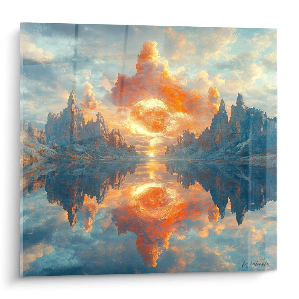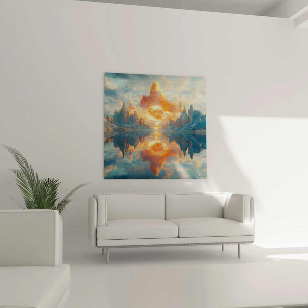 Ce tableau paysage fantastique révèle une scène époustouflante où se mélangent réalisme et imaginaire. L'œuvre présente un paysage montagneux majestueux baigné dans une lumière dorée exceptionnelle, créant une atmosphère de pure contemplation. Le tableau montagne soleil couchant capture un moment suspendu dans le temps, où les éléments naturels semblent danser dans une harmonie parfaite. Cette décoration murale paysage surréaliste transforme instantanément l'espace par sa présence imposante et sa capacité à transporter l'observateur vers un monde onirique. L'effet de reflet parfait dans l'eau amplifie la dimension mystique de l'ensemble, créant une symétrie troublante qui fascine le regard.